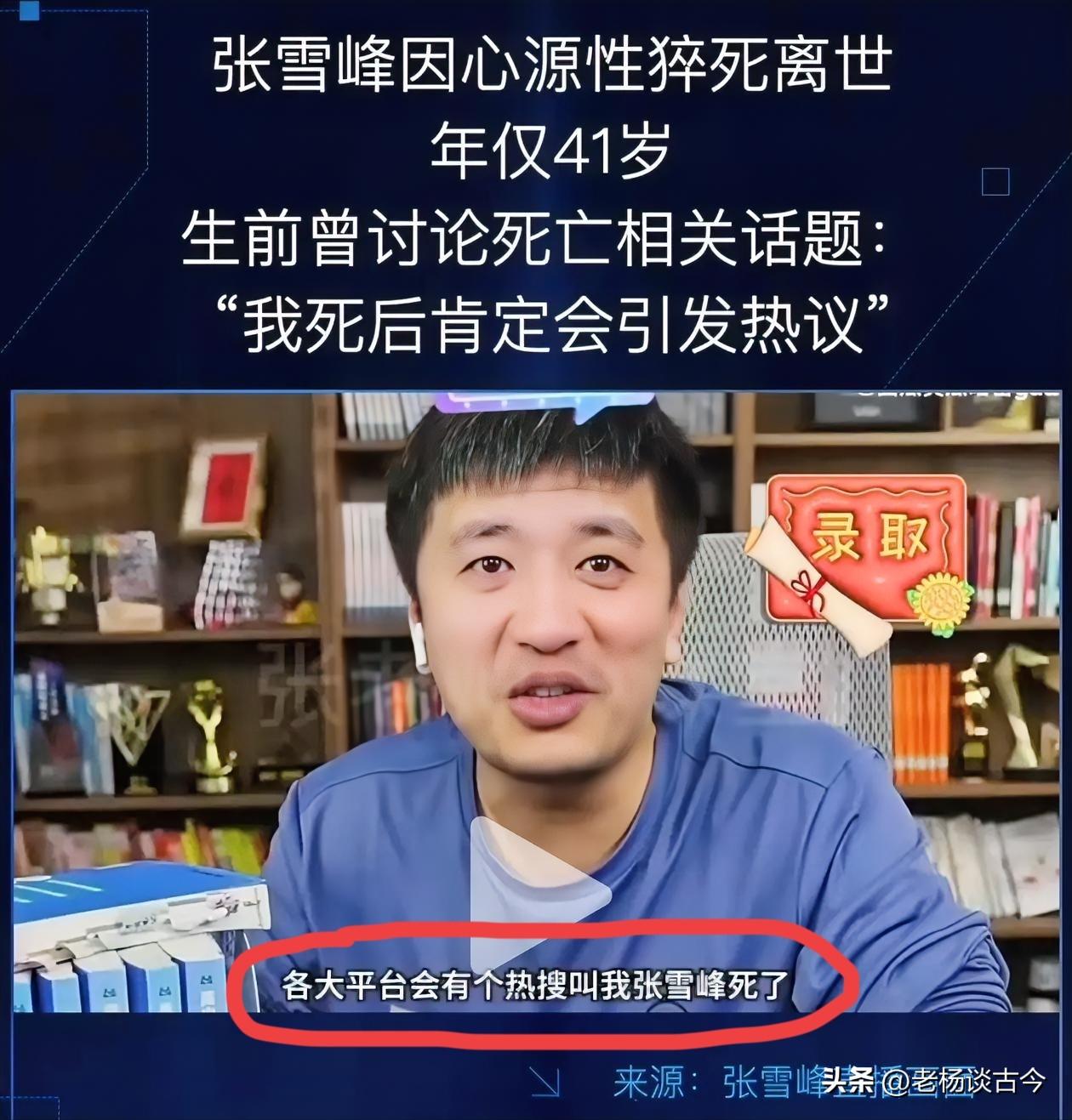 “我有一个目标,希望我死后各大平台会有个热搜叫张雪峰死了,希望我能成为一代人的回忆”——张雪峰 消息来的太突然,我的大脑一片空白,心情久久不能平复,甚至我以为是谁在搞恶作剧,明明前几天还发视频讲解专业课,朋友圈还更新跑步锻炼的老师怎么会突然没了?[流泪][流泪][流泪] 我相信大多数家长和孩子都看过他的报考视频,有的还亲自连线问他报考问题,他总能一针见血地说出哪个学校,哪个专业是否适合你家孩子,帮助了无数出身寒门的学子。 我也是其帮助过的一员。所以,当看到他离世的消息的时候,我真的无法接受,手都是颤抖的。 或许就像他曾经说的:“所有唾手可得的快乐,都早已在暗中标好了价格。” 也记得他曾说过:“不要当父母需要你的时候,除了泪水一无所有,这就是你努力学习的理由。” 这段话,曾是多少寒门学子深夜苦读的支撑。 如今,41岁的他突然就走了,我不知道该为他做些什么,但总记得他生前说过的一个愿望: 希望自己去世以后各大平台都在纪念他,他能成为一代人的回忆就满足了。 雪峰老师,虽然学生目前力量薄弱,粉丝量少,但是也想尽一份力量助力你的愿望,你永远活在学生的心里。 老师,您一路走好[流泪][流泪][流泪]