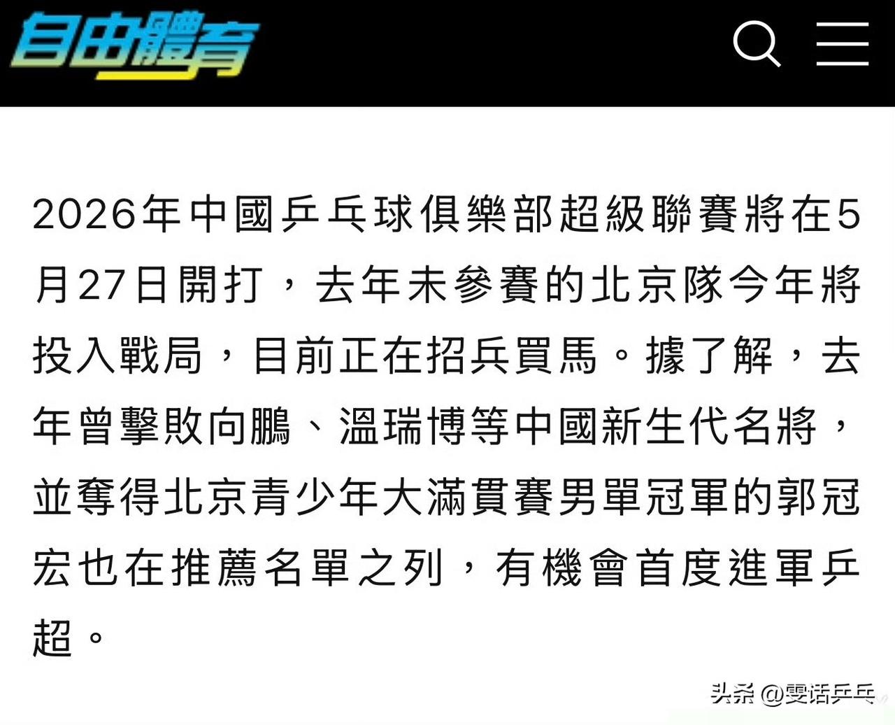 Breaking News 北京队将组建俱乐部参加今年的乒超联赛 郭冠宏可能会成为其中的一员 2026.3.24
