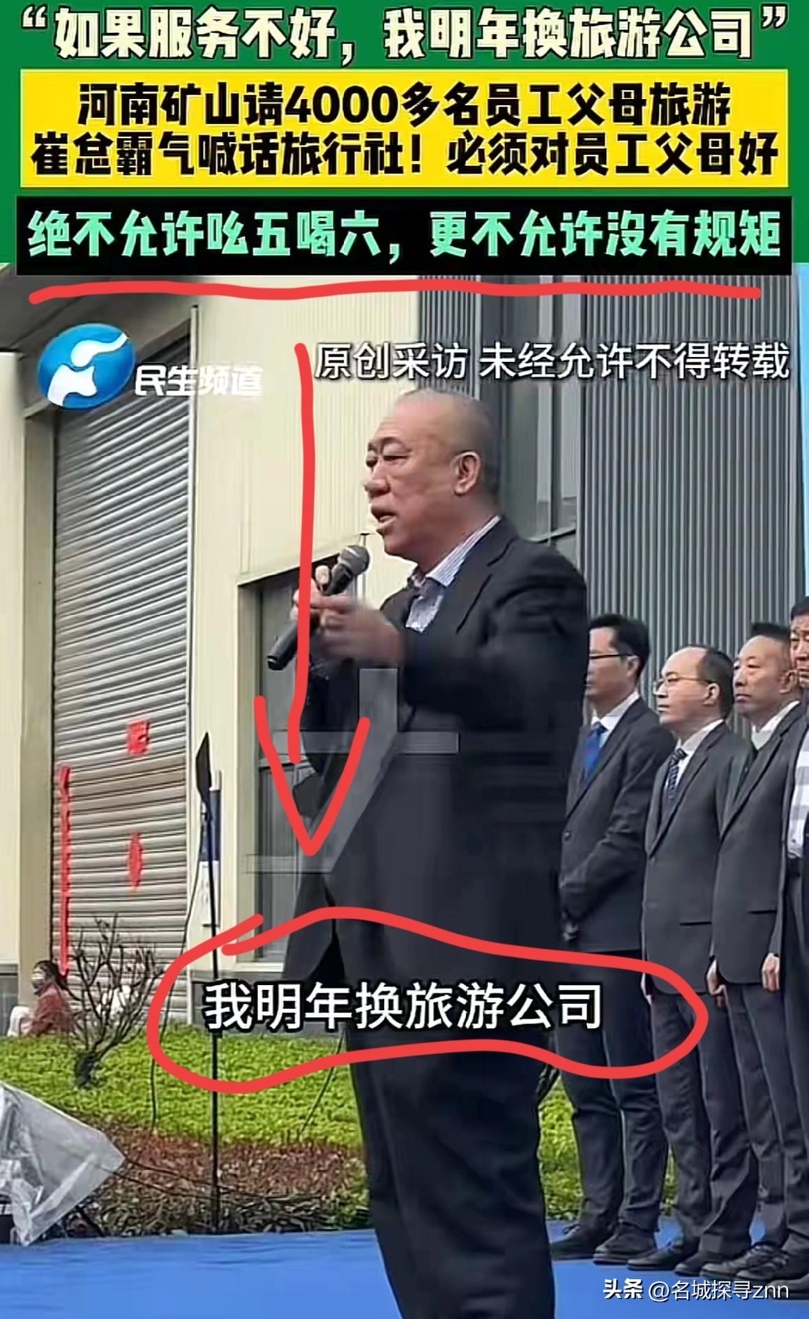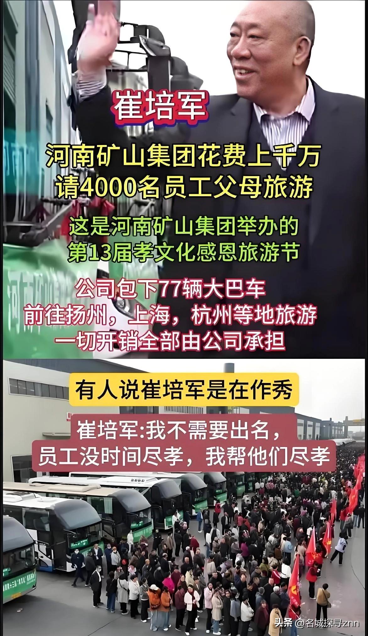活该人家崔培军挣大钱啊!就在刚刚,崔总安排旗下4000多员工父母旅游,出发前霸气喊话旅游公司,服务好,不准吆五喝六,不然明年换人! 78辆豪华大巴在厂区外一字排开,车身上贴着醒目的孝文化旅游节标识,4000多名头发花白的老人在子女和工作人员的搀扶下有序登车,脸上的笑意藏都藏不住。崔培军站在出发台中央,手里攥着话筒,声音里没有半点老板的架子,全是实打实的恳切。 他盯着台下的旅行社工作人员,一字一句重复着要求,四星级酒店必须住满,三餐要合老人胃口,导游说话要软和,走路要慢,连老人上下车都得有人搭把手。他不怕多花钱,就怕这些一辈子没出过远门的长辈,在外面受半分委屈。 没人会觉得崔培军的要求过分,毕竟这已经是他连续第十四年做这件事。从2010年第一次组织几十位员工父母出游开始,这个习惯就没断过。 北京、三亚、上海、江南水乡,员工父母的脚步跟着企业的发展越走越远,每一次出行的费用全由企业包揽,今年更是砸了近千万元,连随行的医护人员、备用药品都提前备得妥妥当当。他常说,员工把青春耗在厂里,替他守着家业,他就得替员工守着家里的老人。 这些老人大多是从农村走出来的,一辈子省吃俭用,子女给的钱舍不得花,连县城都很少去,更别说看看外面的世界。他要做的,就是把这份孝心替员工递到老人手里。 这份关怀从来不是一时兴起的作秀。在河南矿山,孝亲是刻进骨子里的规矩。每月,公司财务会自动把500到2000元不等的孝亲金,直接打进员工父母的银行卡里,绕开子女,确保钱实实在在落在长辈手里。 中秋团圆宴上,他会挨个给老人敬酒,听他们唠家常,问子女在厂里的工作情况;员工家里有红白事,他再忙也要派人到场,能帮的绝不含糊。他甚至把“孝”写进了用人标准,不孝的人,能力再强也不用。在他眼里,一个连父母都不疼的人,不可能真心对待企业和同事。 现场的员工看着台上的崔培军,心里的踏实感比拿奖金还实在。有人说,在别的地方打工是卖力气换钱,在河南矿山是把家安在了这里。父母能免费旅游,还能每月领钱,这份体面是老板给的,也是企业给的。 他们知道,崔培军的霸气不是对着员工耍威风,是对着外界护着自己人。他敢跟旅行社拍桌子,是因为他把员工的父母当成了自己的长辈,容不得半点怠慢;他敢连续十四年砸钱做福利,是因为他清楚,人心换人心,员工把企业当家,企业才能走得远。 有人说崔培军是在搞“道德绑架”,是用孝文化绑架员工。可看看厂里的情况就知道,二十多年没拖欠过一次工资,没裁过一个员工,疫情最艰难的时候也没降过薪,这样的“绑架”,哪个打工人不想要?他不是在用钱买忠诚,是在用行动告诉所有人,企业不是冷冰冰的机器,是有人情味的家。 当别的老板还在算人力成本的时候,他已经在算人心的温度;当别的企业还在喊“狼性文化”的时候,他已经把孝亲敬老做成了最硬核的竞争力。 这次旅游的行程里,有南京的中山陵,有苏州的园林,有无锡的太湖,每一处都是他亲自敲定的。他要让老人们看看,自己的子女在厂里挣的钱,能让他们走得更远、看得更多;他要让员工知道,好好干,不仅自己能过上好日子,父母也能跟着享福。 他站在台边,看着最后一辆大巴缓缓驶离厂区,挥着手直到看不见车影,才转身回到办公室。没人知道他那一刻在想什么,但所有人都清楚,明年这个时候,还会有另一批老人坐上大巴,去看更远的风景。 这不是什么惊天动地的壮举,只是一个老板对员工最朴素的承诺。可就是这样的承诺,坚持了十四年,暖了四千多个家庭,也让河南矿山从一个小作坊,长成了年营收百亿的行业巨头。 崔培军常说,钱是赚不完的,但人心是攒出来的。他用十四年的时间证明,真正的企业担当,从来不是喊出来的,是把员工的父母放在心上,把每一份福利落到实处,把每一句承诺做到极致。 各位读者你们怎么看?欢迎在评论区讨论。