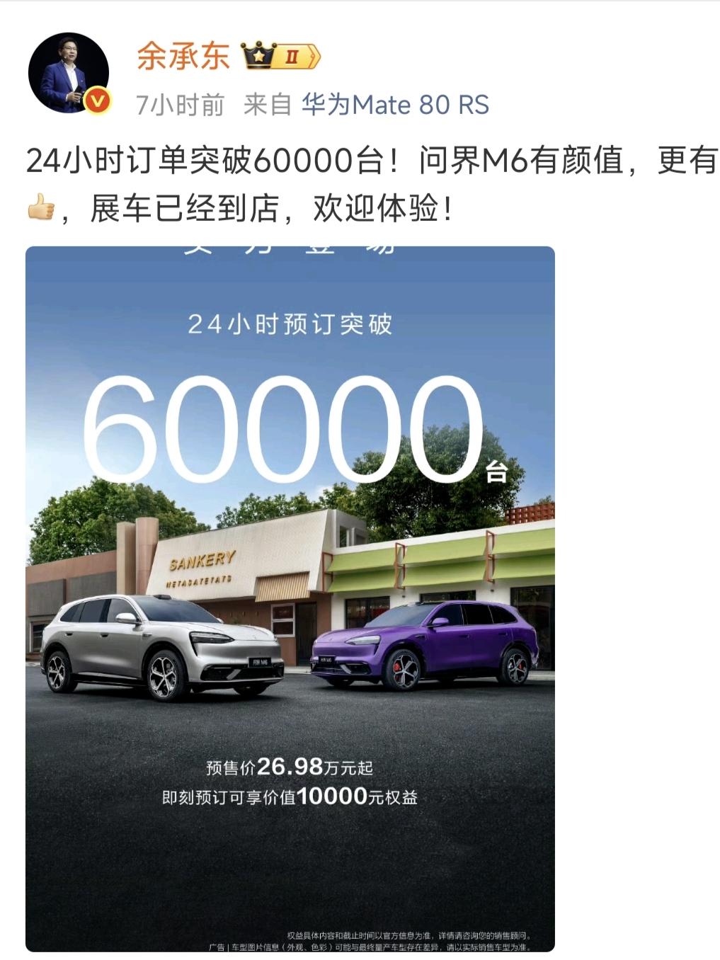 一天之内,余承东传来两个好消息 1,问界M6订单突破60000台 2,尚界Z7