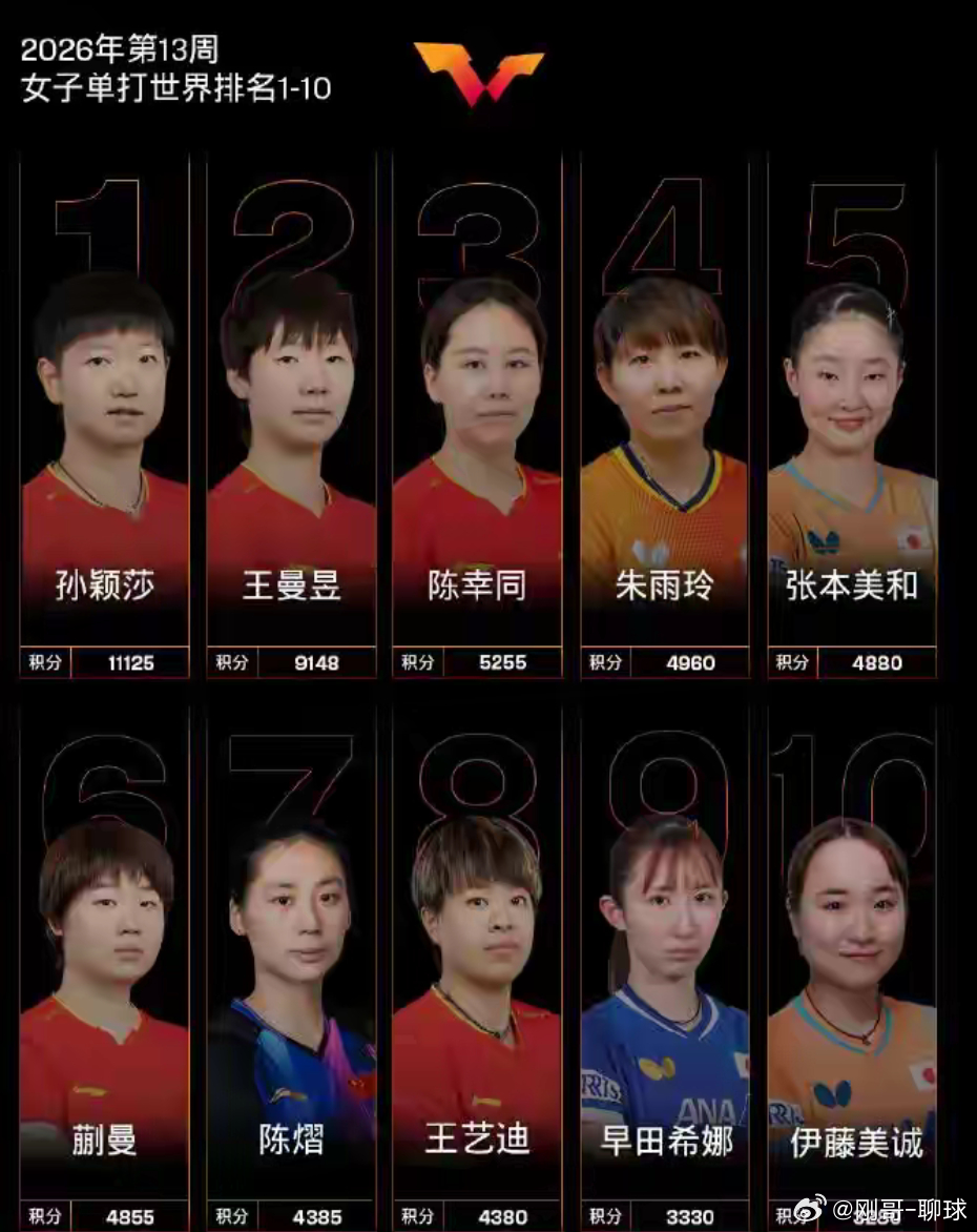 国际乒联最新排名出炉:王楚钦、孙颖莎继续领跑国际乒联最新世界排名 3月23日,国际乒联公布2026年第13周世界排名,国乒男女单继续稳居第一梯队。 男单 王楚钦以10750分稳坐世界第一,领先第二名瑞典选手莫雷加德超4000分。林诗栋因积分到期及赛事影响,排名下滑至第五,无缘澳门世界杯种子位。向鹏位列第九,梁靖崑、温瑞博、周启豪、陈垣宇分列13、17、22、23位。女单 孙颖莎以11125分遥遥领先,王曼昱、陈幸同包揽二、三位,国乒实现前三霸榜。蒯曼第六,陈熠第七,王艺迪第八,石洵瑶第十五。日本选手张本美和升至第五,创个人新高。