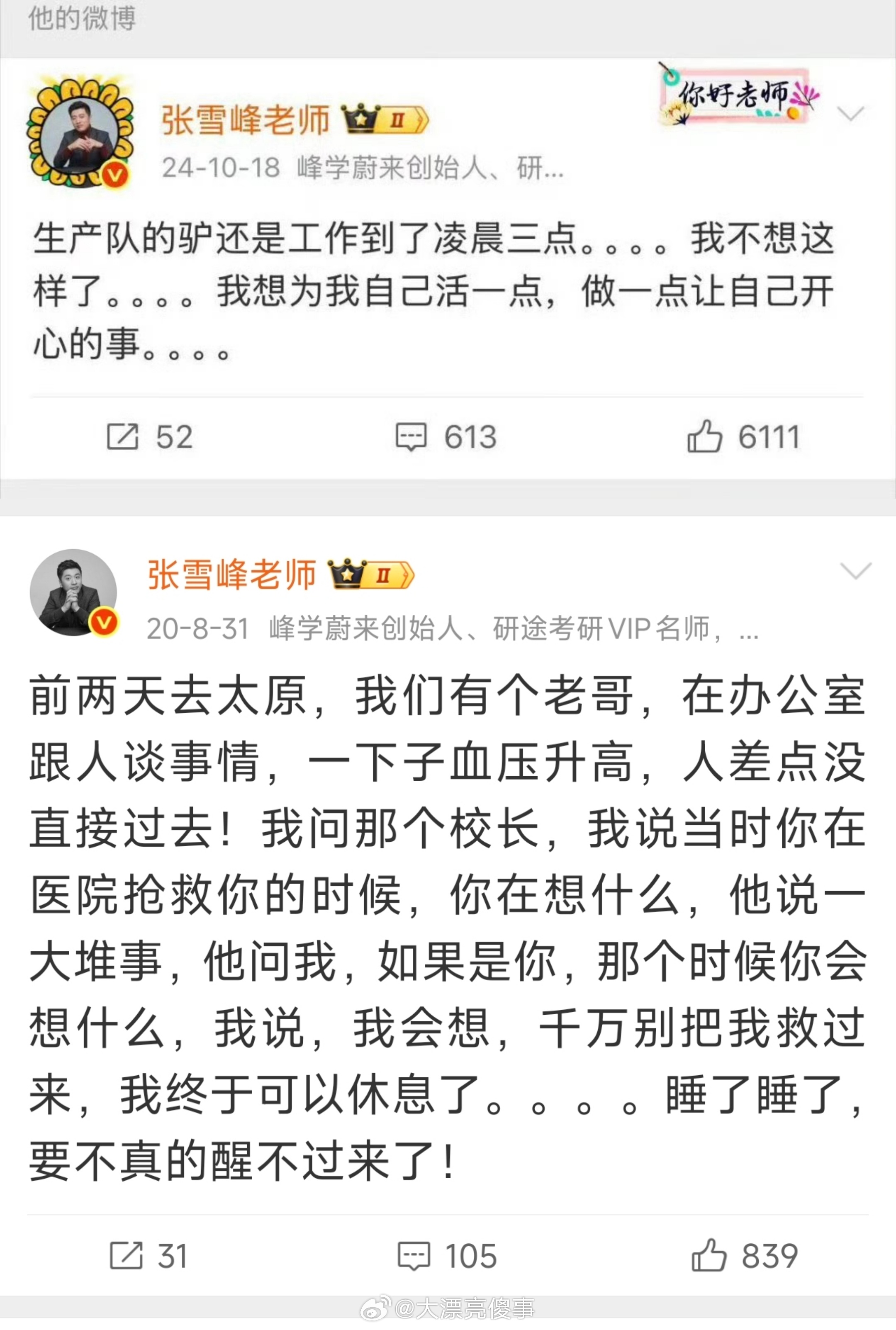 张雪峰微博高频词 凌晨和累人啊,一个人要累到什么地步才会想到把死亡都看作休息。。。