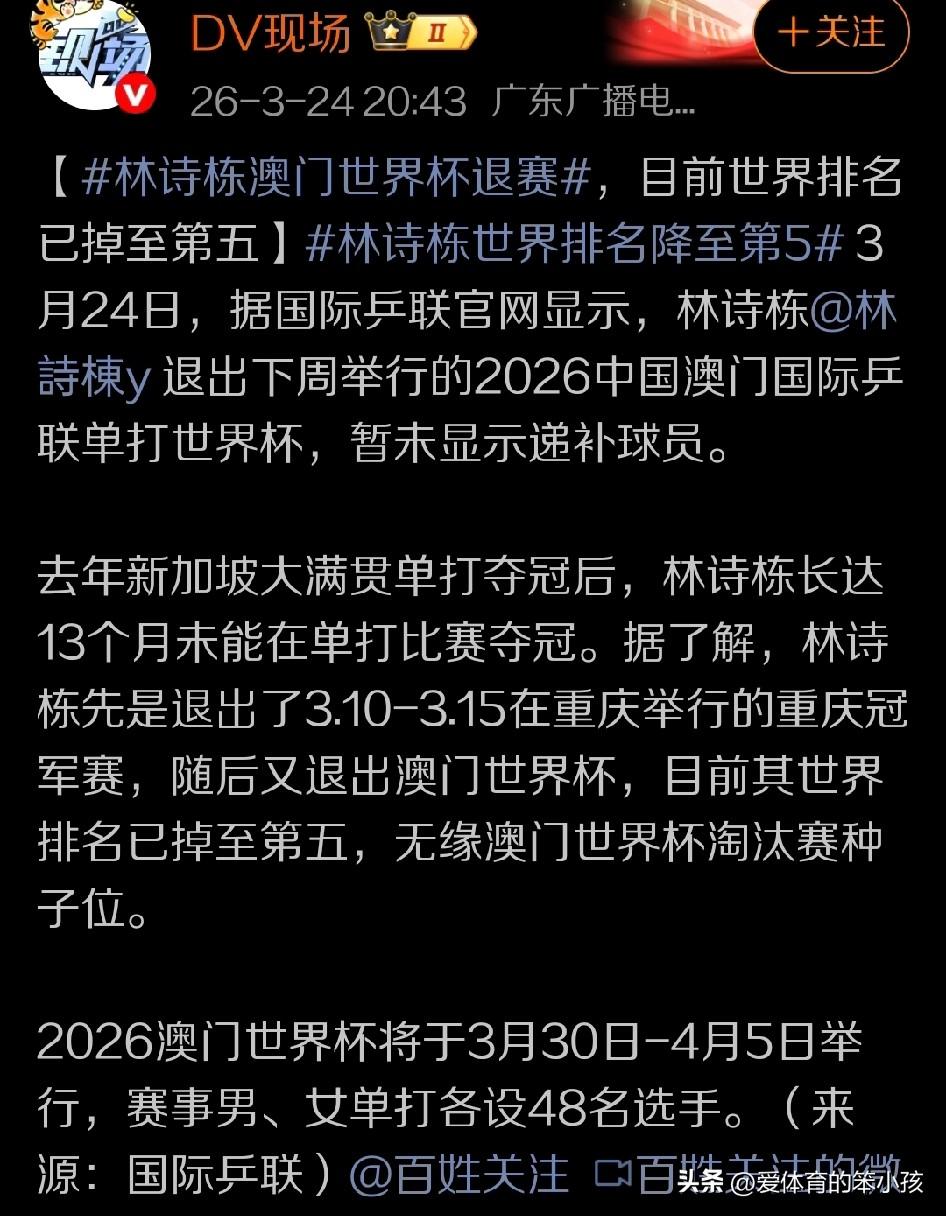 按照相关媒体和网站的最新消息,综合各方信息,乒乓球世界杯的赛场上,已经报名参赛的国乒主力球员,同时也是直接通过相对靠前的世界排名获得参赛席位的林诗栋,由于近期受到伤病困扰,世界排名持续下滑,已经从原来的世界排名前2逐步滑落到世界排名第5的位置。这也将让他在世界杯单打比拼当中直接失去一个种子席位。 出于为林诗栋的长久发展考虑,国乒团队在最新一次公布的名单当中,能看出林诗栋已经在世界杯参赛名单里面直接消失。而他的这个参赛名额则将由中国香港的林兆恒替补获得。 在很多球迷看来,这的确是一种莫大的遗憾。也说明近期的林诗栋,确实无论在身体状态,体能状态还是技术状态,包括心理状态的调整方面,都出现了一些问题。 因为一度排名世界榜首位置,而并不算长的时间内就迅速排名下滑,如今已经滑落到世界排名第5的位置。甚至如果他状态不能很好的复苏,回来参赛又继续世界排名持续下滑的话,对于林诗栋心理和比赛状态的打击,以及对于整个国乒男队总体竞争力的形成,包括接下来备战世乒赛男团的比赛,都将带来新的困难和压力。 所以在这种前提下,让林诗栋选择退赛也是一种长远考虑,只是这种长远考虑和这种鲜少出现的选择方式,能否真正帮助到林诗栋,又是否可以让国乒团队在接下来的世乒赛团体赛,以及未来的其他赛事竞争当中能够找到更好的保持好成绩的方法,需要我们持续关注。 也让我们期待着林诗栋不要受到眼前困难的干扰,能够在他重新回归时继续上演出色发挥。也希望这样的退赛可以让林诗栋以退为进,有所突破,并在重新回到世界赛场时,给我们带来新的精彩!