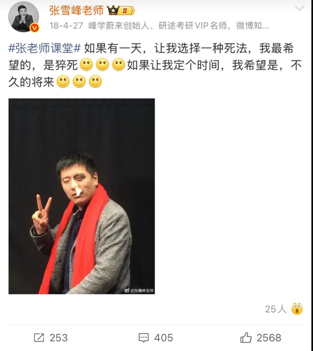 张雪峰18年发帖说过希望自己的死法是猝死
