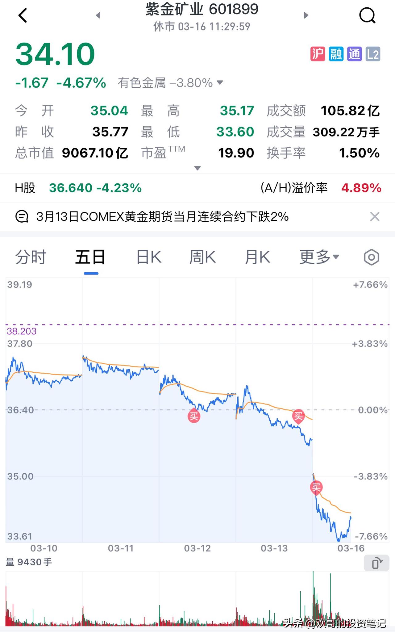 紫金矿业:跌出来的机会,基本面从未动摇 紫金矿业这波跌势,看得不少人心里发慌,但抛开短期情绪,核心逻辑其实很清晰——这家公司的基本面压根没出问题,当下的调整,更多是市场情绪、筹码结构和外部预期共振下的短期阵痛。 按700-800亿的中性预测算,当前市盈率也就12-13倍。估值从来不是凭空定的,而是锚定紫金未来的增长逻辑。紫金的中高速增长是实打实的,在这个前提下,12-13倍的估值底,长期来看是站得住脚的。短期的滞涨,无非是被市场情绪、筹码博弈和油价滞涨预期牵着走,跟公司本身的经营、业绩兑现没半点关系。 对长期投资者来说,这种情绪杀跌往往不是风险,反而是机会。我早就预判到了这波调整:周末美股黄金、有色板块集体重挫,平均跌幅接近5%,南方铜业跌超5%,纽蒙特黄金也跌了4%多。按照这个势头,周一A股有色板块低开几乎是板上钉钉,招金大概率要跌到29左右。基于对紫金的长期看好,我果断在35元以下和34元两个位置,分别建仓了两单。 今天的盘面确实比预想的更极端,大盘带着有色板块一路下探,紫金直接跌了近7%,山东黄金、赤峰黄金这些小标的更是直奔跌停。但越是这样,越要分清短期波动和长期价值。紫金从44元一路跌到34元,回调幅度已经不小,前期盈利盘也兑现了不少,抛压在逐步释放。更关键的是,公司的年报和一季报即将披露,这往往是验证基本面、修复情绪的关键节点。 再看黄金板块的底层逻辑,周五黄金股的大阴线,其实已经把“美联储不降息”的最悲观预期全部消化了。即便如此,金价也没有出现恐慌性暴跌,这说明下方的支撑很强,空头动能已经耗尽,典型的利空出尽。而且美联储加息的可能性几乎为零——现在加息,无异于给本就脆弱的美债市场拔氧气管,美国根本承受不起。等降息的预期彻底落地,黄金就会回归避险+抗通胀的核心属性,重新走出上涨趋势,原油和黄金也不会一直处于“跷跷板”的对立状态。 说白了现在就是别人恐惧的时候,我反而觉得兴奋。虽然短期心里难免有点忐忑,但紫金的基本面没有任何重大变化,估值也处在合理区间。这波调整到底是短期情绪宣泄,还是趋势反转,交给时间去验证就好。但从企业经营和长期价值来看,当下的位置,绝对是一个值得布局的窗口。