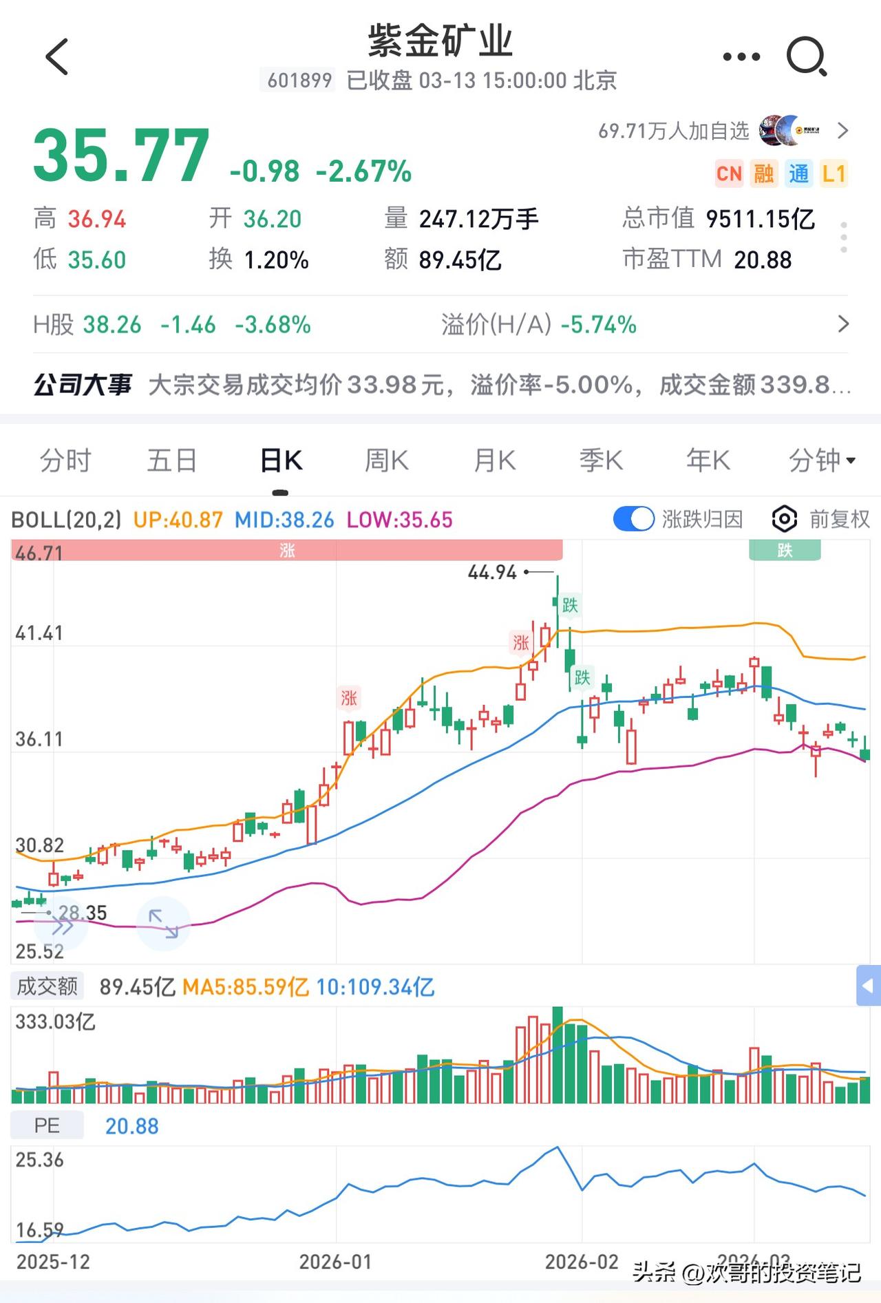 金铜矿业股的割裂行情:基本面稳如泰山,股价为何跌跌不休 最近持有金铜矿业股的投资者,大概都有一肚子说不出来的憋屈,持仓体验可以说糟糕到了极点。明明期货端价格大涨,股价却几乎纹丝不动,半点不跟涨;可只要期货价格稍微回调一点,股价就跌得天崩地裂,完全是跟跌不跟涨的极端走势。 说起来也让人费解,这段时间不管国际局势怎么风云变幻,金价始终稳稳站在5000美元以上,铜价也在13000美元上下徘徊,大宗商品价格可以说是稳如泰山。可反观二级市场的矿业股,走势却完全是另一副样子,市场里的资金仿佛惶惶不可终日,一点风吹草动就慌不择路地抛售,完全无视现货端的价格支撑。 这其中最让人想不通的,就是黄金和黄金股的背离走势。当下地缘冲突还在持续,全球格局日益动荡失序,正处在大变局之中。美国本就高企的债务规模,如今又要面临巨额的军费开支,未来债务大概率还要继续扩张,美元信用持续被削弱,无论从哪个角度看,黄金的长期上涨逻辑都变得更加确定,更加无可撼动。 可资本市场偏偏不看这个长期大势,反而揪着“油价上涨会导致美联储停止降息,进而压制金价”这个短期逻辑反复交易。说实话,我实在是百思不得其解,黄金的定价锚从来都是全球货币信用与地缘格局的长期趋势,可在这样的历史大势面前,居然有人会短视到,去计较那百分之零点几的利息变动。 更让人觉得不合理的,是头部矿企之间肉眼可见的估值分化,尤其是紫金矿业和南方铜业的对比,越看越让人觉得费解。南方铜业目前总市值1万亿,全年收入930亿,净利润305亿,每股净资产94元,对应下来市销率11倍,市盈率34倍,市净率更是到了13倍。 再看紫金矿业,当前总市值9500亿上下,单算纯矿山收入、剔除低毛利的冶炼贸易业务就有1250亿,全年净利润510亿,每股净资产6.8元,市销率不到8倍,市盈率19倍,市净率6倍。不止是当下的盈利规模和估值水平全面占优,明年的产量规划上,南方铜业预计增长5个点,紫金矿业的增速能达到13个点,成长性也明显更胜一筹。两相比较,紫金矿业的优势一目了然,估值却明显被严重低估了。 说到紫金矿业,就更让人纳闷了。之前金价跌到3460美元、铜价跌到9800美元的时候,公司一年都能赚到600亿利润,对应PE也才15倍,我实在不知道市场到底想要多低的估值才满意。现在金价在5100美元附近横盘,铜价在1.3万美元的高位稳住,公司的盈利基本面比之前好得多,可股价却走得像个滑梯,一路震荡向下,完全看不到期货端价格的强力支撑。 从技术面看,紫金矿业的走势确实很难看,短期回调幅度不小,可公司的核心基本面没有任何问题,产能扩张、资源储备都在稳步推进。26年开年第一天的价格,完全可以当做今年行情的基点,去年创下的44.94的高点,我始终相信,终将被打破。