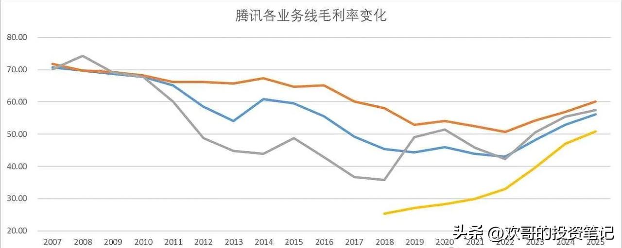 腾讯最新的业绩表现格外稳健,去年实现约3000亿港币的利润,和此前的预测完全吻合,公司还手握超万亿人民币的金融投资资产,单看当前估值,依旧是一眼就能看清的低估状态。企业服务板块也迎来了增长突破,四季度增速达到22%,毛利率表现十分亮眼,正式步入规模化盈利的阶段。腾讯三大核心业务板块的毛利率基本都稳定在50%到60%,金融科技和企业服务板块的毛利率提升尤为突出,四季度直接升至51%,彻底改变了以往低毛利的局面。关于AI领域的具体布局和后续规划,还需要等待电话会释放更多细节。 这几年腾讯的战略布局也存在值得探讨的问题,公司将大量现金用于股票回购,反倒为南非大股东减持起到了抬轿作用,这样的操作并不算明智。更合理的方向应该是把资金投向AI研发,内部激励舍弃期权改用现金,同时督促南非大股东在低位完成减持,这样的战略调整才更利于长远发展。 腾讯的核心基本盘依旧牢固,微信月活用户还在持续增长,涨幅2.38%至14.18亿,为各项业务筑牢了生态根基。网络游戏收入增长22.21%至2416亿,新游《三角洲》上线加上海外业务发力,让游戏板块再次提速增长;社区增值服务收入增长5.1%至1277亿元;网络广告收入增长19.43%至1450亿元,视频号成为近三年广告增速提升的关键,广告加载率相比竞争对手还有提升空间;金融科技及企业服务收入增长8.25%至2294亿元,各业务线增速相较2024年均有提升,规模效应体现得十分明显。2025年公司整体毛利率提升3.31%至56.21%,利润率也提升2.26%至32.56%,盈利水平持续优化。 整体来看,腾讯2025年财报呈现出AI驱动的高质量增长特点。游戏、广告、云服务等核心业务全部实现加速增长,AI技术不仅提升了广告定向、游戏内容制作等现有业务的效率,更推动云业务迎来规模化盈利的重要转折点。管理层在AI投入上态度坚定且保持理性,既看重资源配置效率,也注重实际回报,同时坚守股东回报的承诺。未来两到三年,微信生态的AI化布局,以及混元大模型的多模态领先优势,会是腾讯最核心的战略看点。