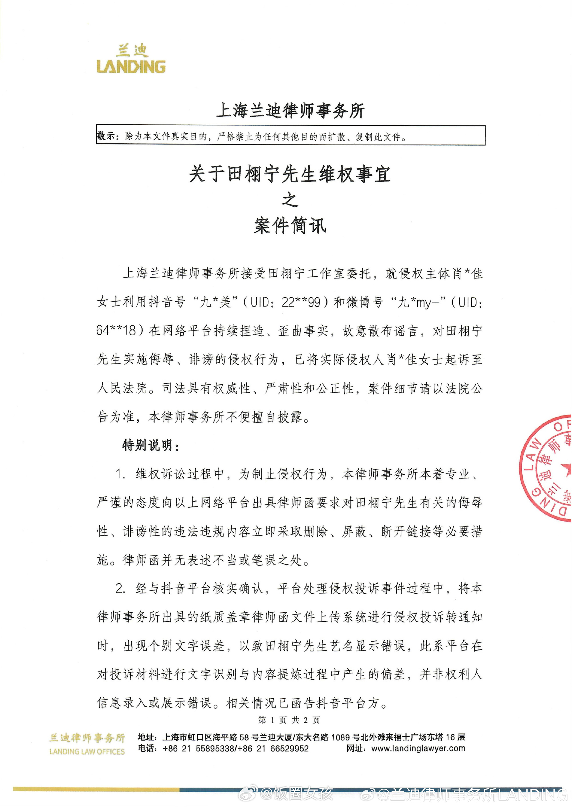 律所发布田栩宁维权案件简讯田栩宁律师案件简讯如下图,网络不是法外之地!支持田栩宁大帅哥!