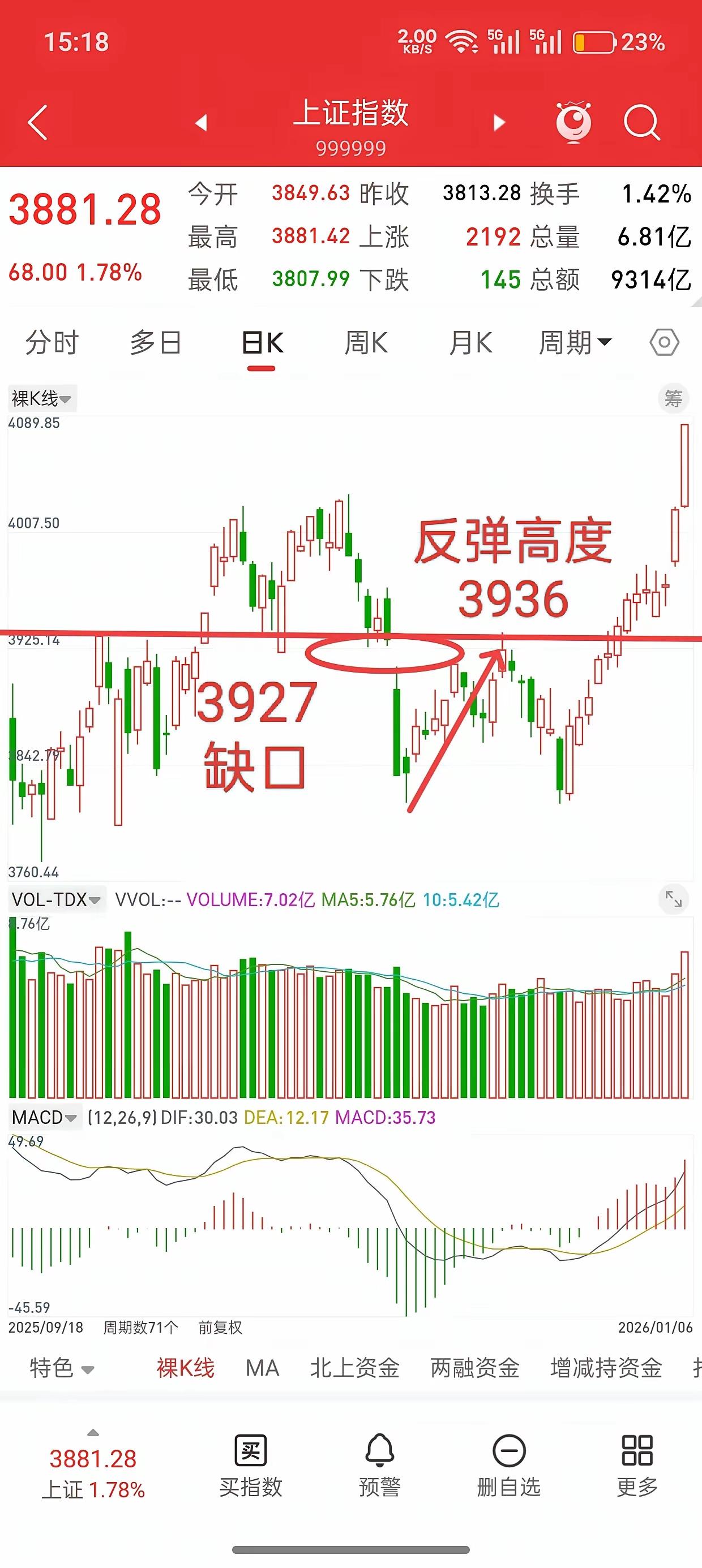 今天A股缩量大涨,不少人账户回了波血,但别高兴太早——那个没补的缺口,就像悬在头顶的小石子,不落地总让人心里发慌。 熟悉A股的都知道,连续下跌后的跳空缺口,短期几乎都会补上。现在3955点那个缺口,大概率跑不掉。但补缺口的路上,不会一直顺顺当当往上冲。去年11月24号之后,中间还回踩了几天,补完缺口甚至还二次探底,这种“折腾”才是常态。 就像今天上午,大盘一度翻绿,多少人扛不住割了肉,结果下午一根中阳拉起来,拍着大腿后悔。这就是市场在考验定力,越是这种时候,越不能跟着情绪乱走。 接下来第一波反弹,先看3950点附近,还差70个点。但别觉得到了目标就能高枕无忧,真补了缺口,反而可能出现新的震荡。倒是有个机会得盯着——前几天说过,大盘见底企稳、补缺口、筑底这段时间,资金活跃度会上来,底部“龙回头”的个股容易冒头,今天就有不少这类股涨停,这种机会得抓牢。 身边炒股的老周今天没动,他说“涨了别追,跌了别慌,盯着缺口补不补,盯着龙头回不回”。这话挺实在,现在的行情,比的不是谁跑得快,是谁看得清、坐得住。 补缺口是迟早的事,但过程肯定绕弯子。手里的票要是没追高,不妨多等等;要是仓位轻,倒可以看看那些跌透了又开始冒头的龙头,说不定能捡个漏。 你们手里的票回血多少了?打算拿到缺口补上吗?