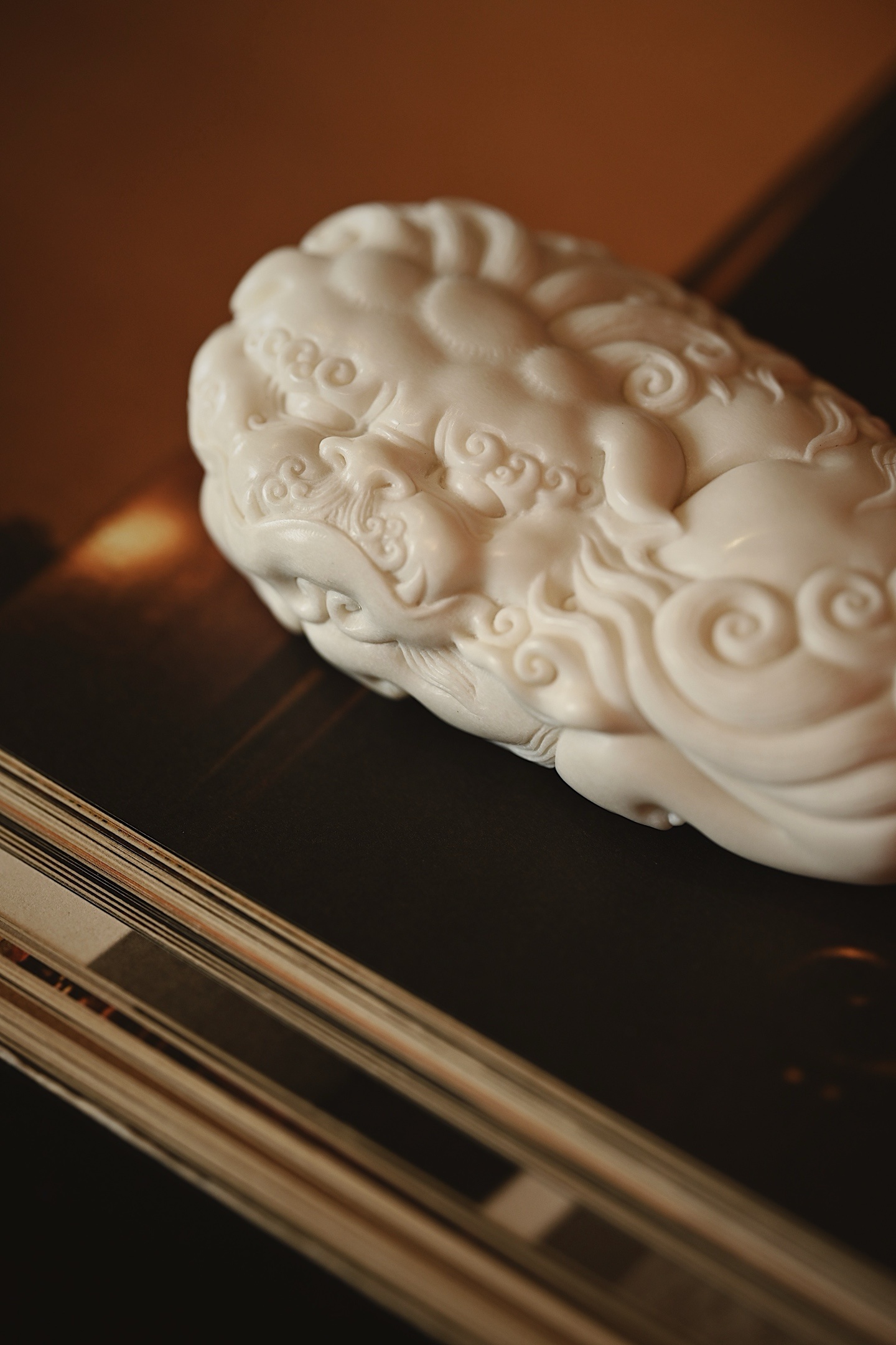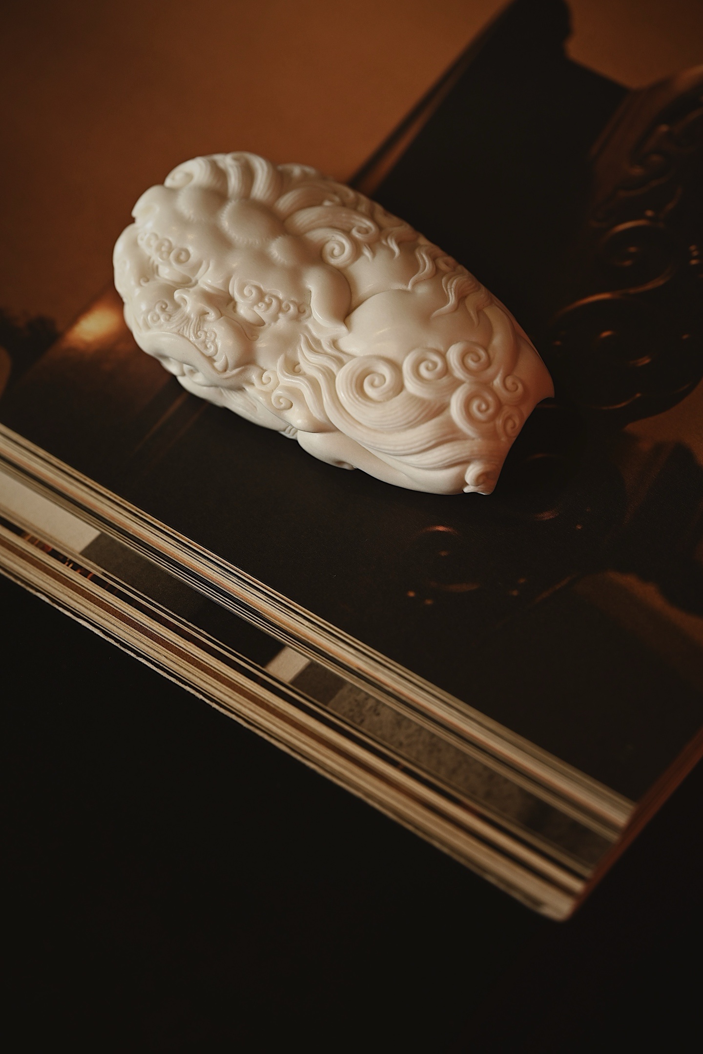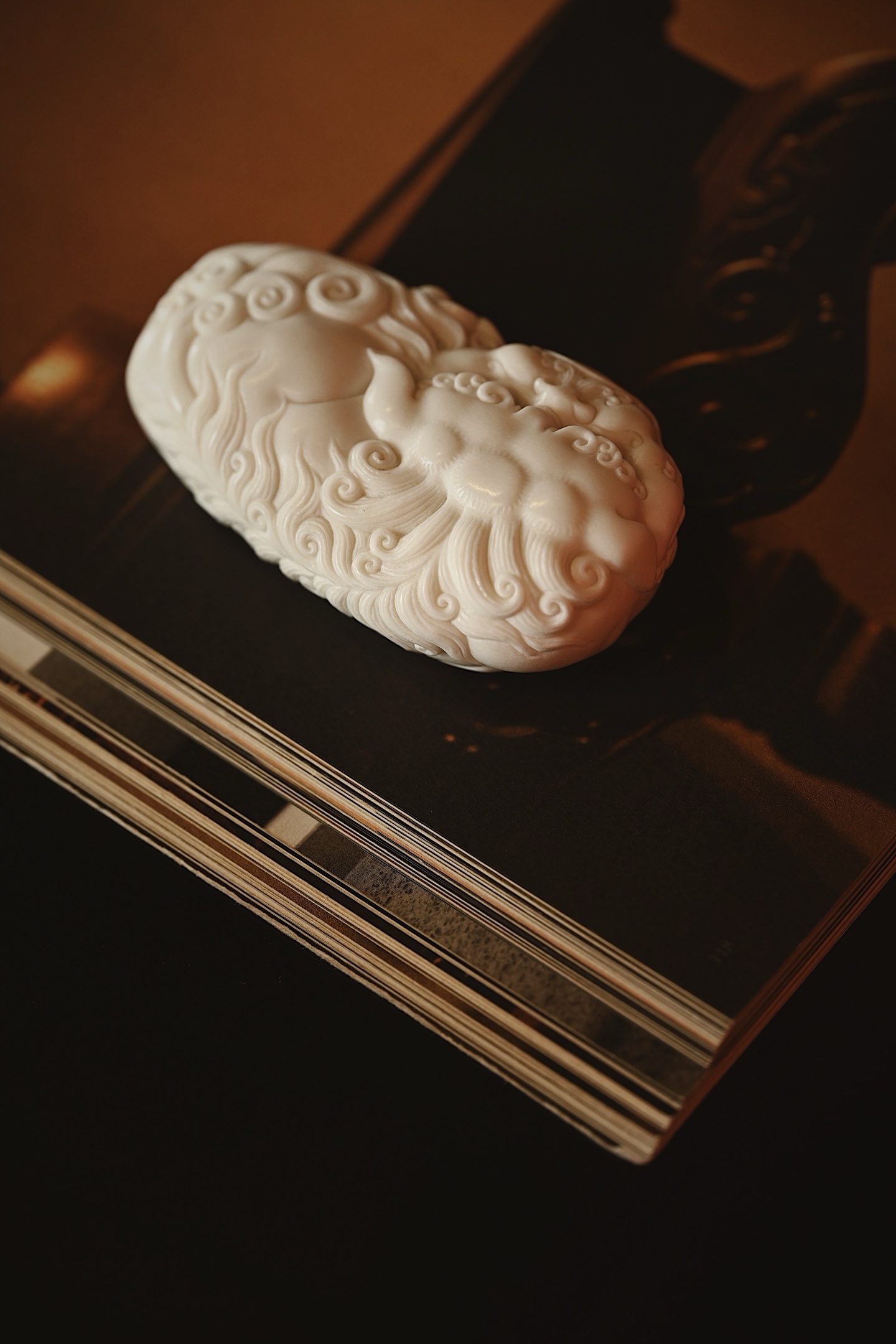 雕刻生动,唐狮鬃毛卷曲如浪,刀工细腻流畅,于方寸之间尽显祥瑞之气,可置茶席赏用,趣味十足。