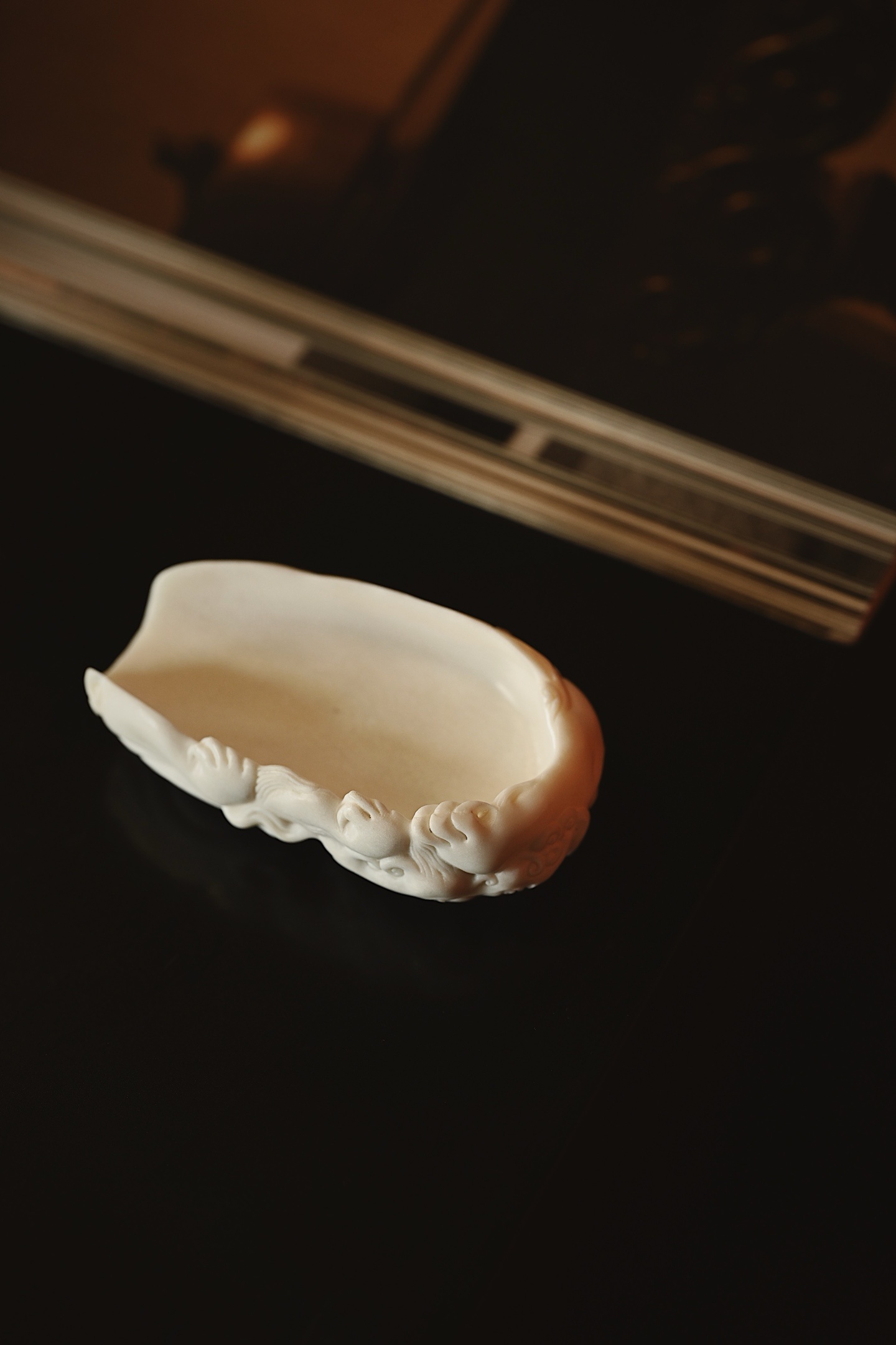 鹿角 | 唐狮 茶则雕刻生动,唐狮鬃毛卷曲如浪,刀工细腻流畅,于方寸之间尽显祥瑞
