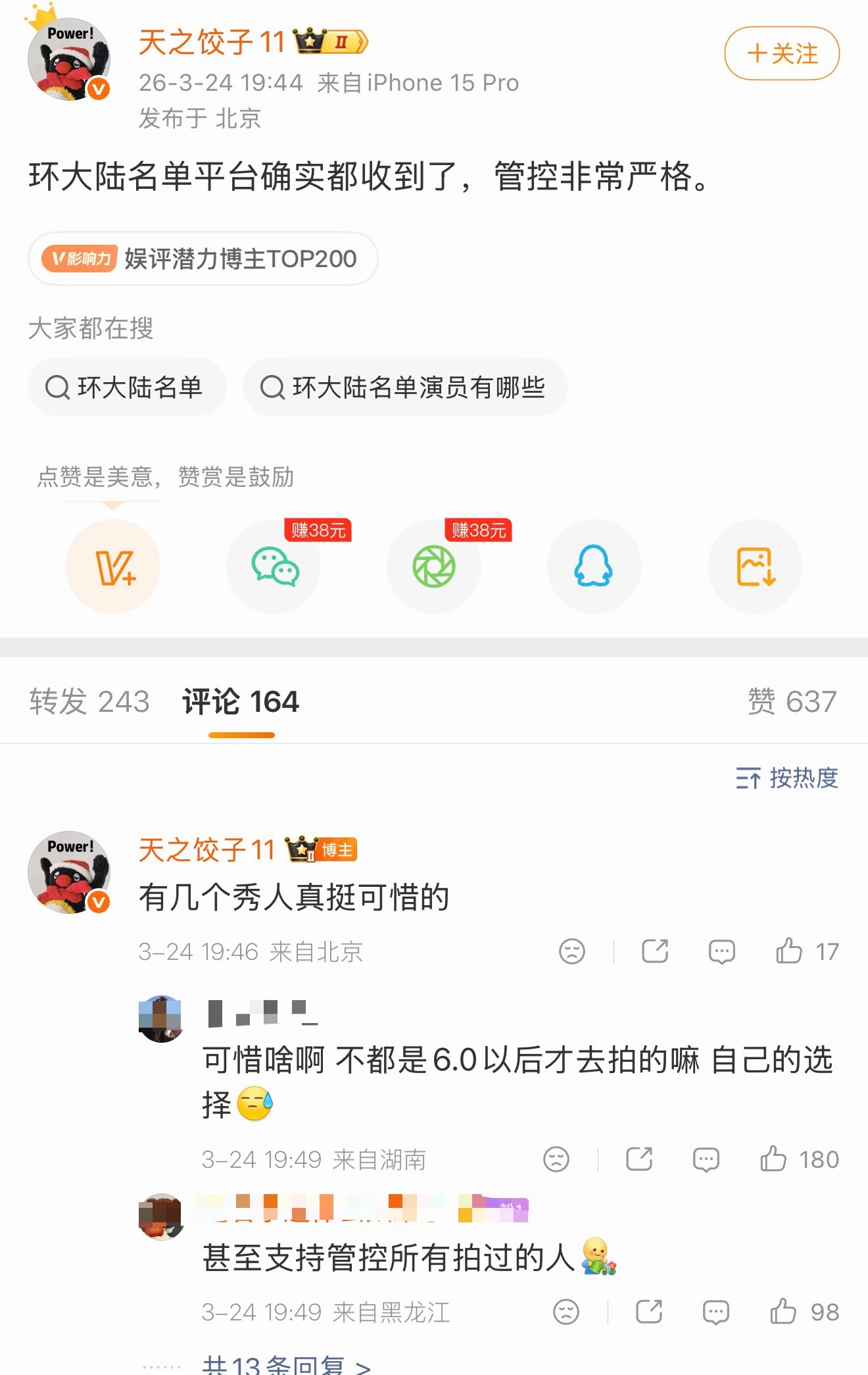 瓜主爆料确实收到了环大陆名单,管控很严格……有几个秀人很可惜,最近几部都💊