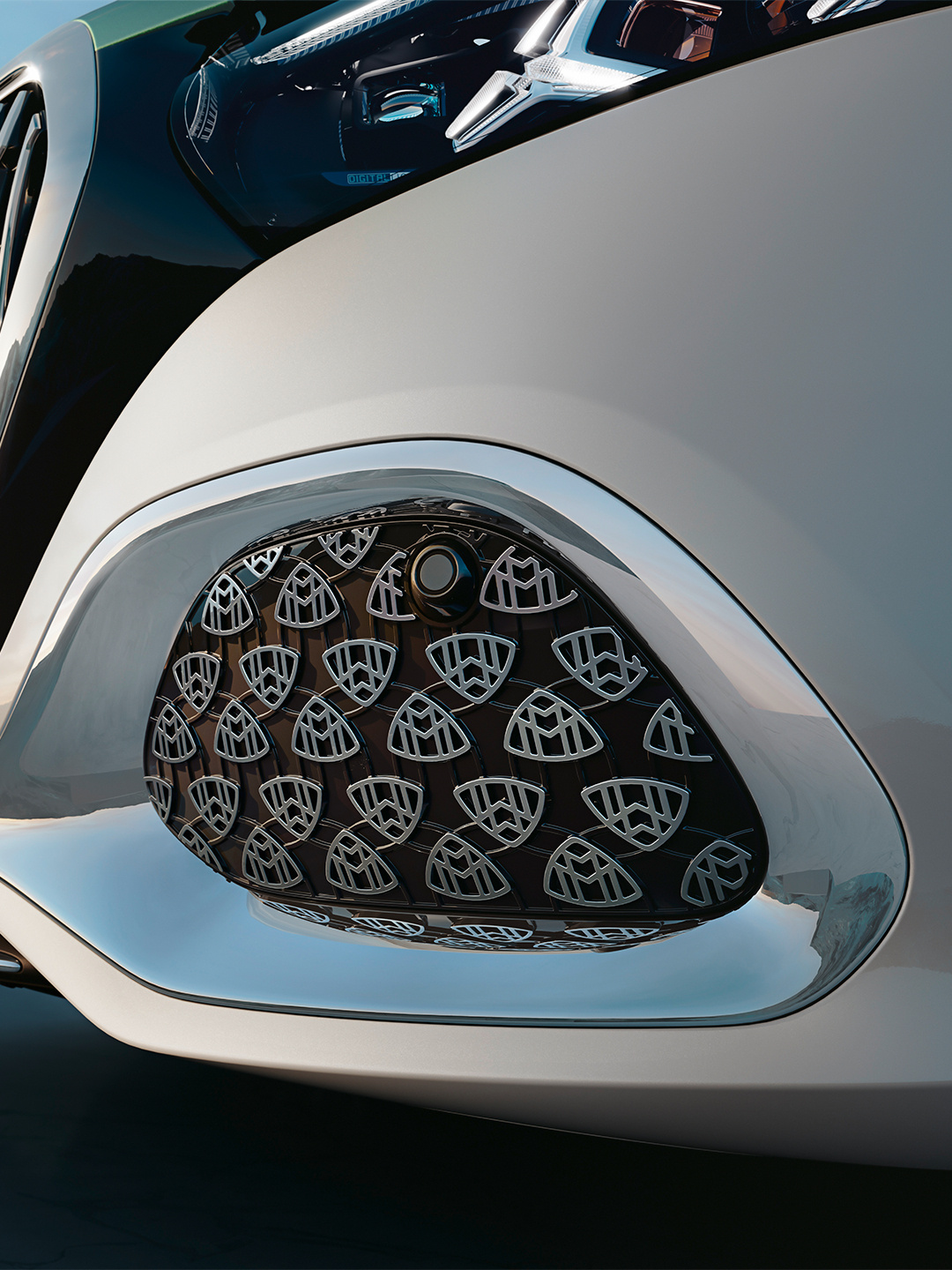 图一看呆我了,新一代迈巴赫S级的logo是真多,前脸左右的副进气口放了一堆这一代