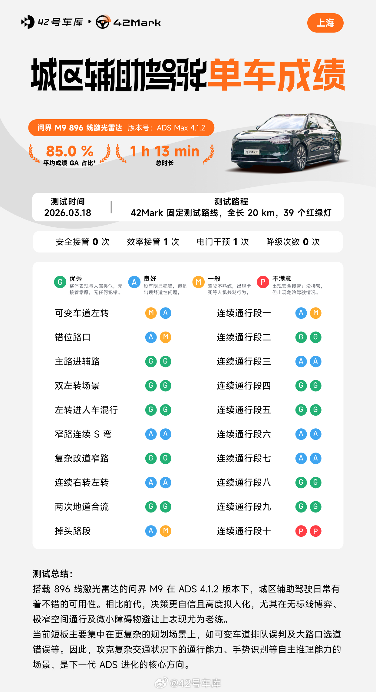 42Mark 城区辅助驾驶榜更新啦!这次测试的是我们刚刚提到手的问界 M9 896 线激光雷达版。网页链接
