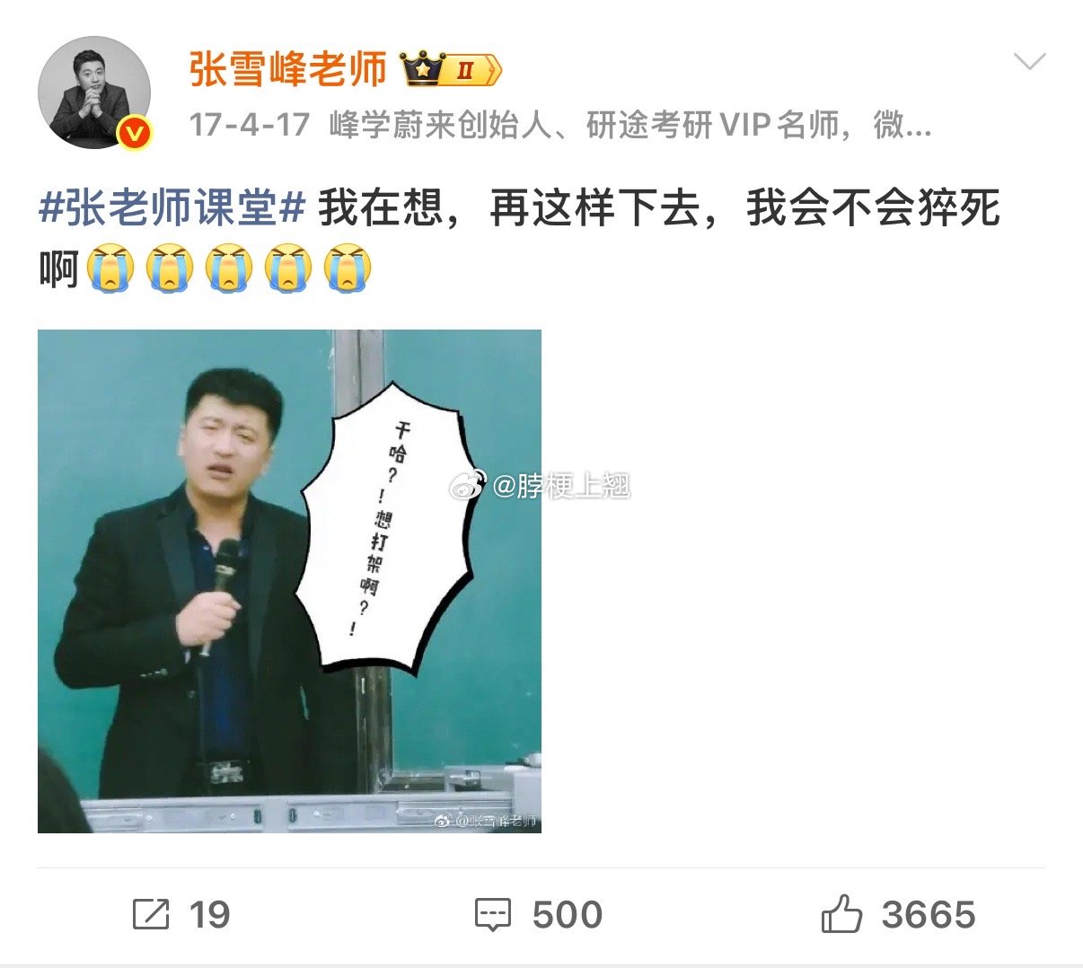 感觉张雪峰是蛮清醒的一个人,怎么会突然之间搞这么大的运动量?据张雪峰朋友圈显