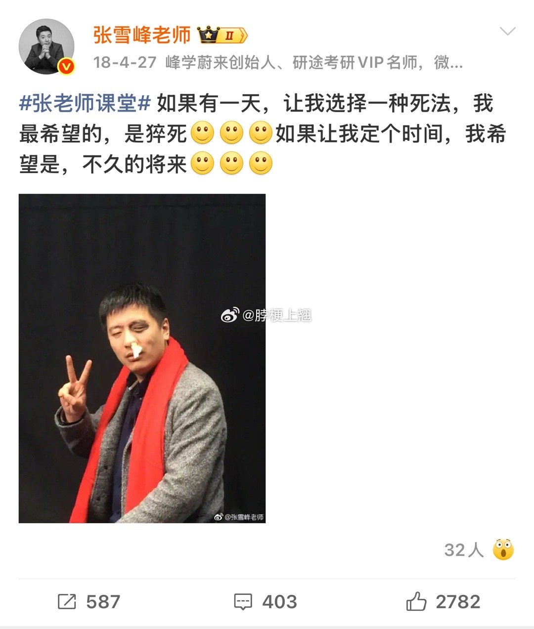 这难道就是一语成谶吗?张雪峰之前的微博说可以选择死法的话,会选择猝死…
