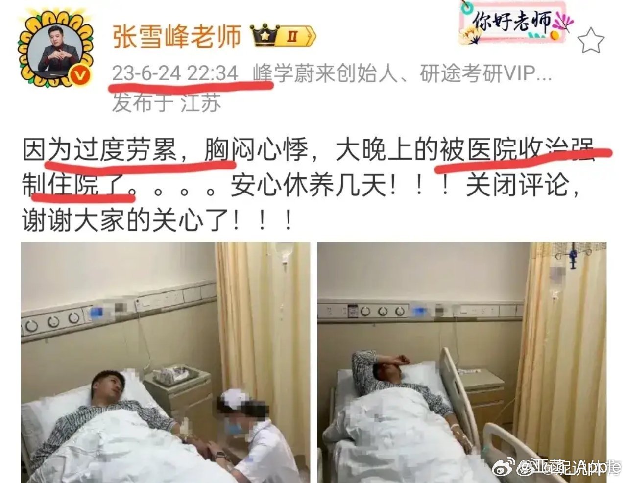 张雪峰老师的嘴唇经常是乌黑的,这是心脏供血不足的表现,医学上称为发绀。早在2023年张雪峰就曾经因为过度劳累,胸闷心悸住过院助理回应张雪峰心脏骤停抢救传闻张雪峰相关账号停止直播