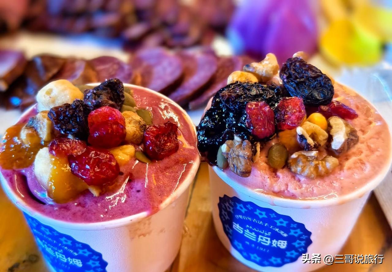 来新疆的100个理由,被古兰丹姆冰激凌狠狠拿捏✨ 来新疆的快乐,一半是风景给的,一半是这口非遗手工冰激凌给的!在伊宁六星街偶遇古兰丹姆,名字藏着《冰山上的来客》的浪漫,意为“冰雪之花”,光是听着就满是西域风情。 拒绝添加剂,只用新疆本地鲜牛奶和土鸡蛋古法制作,绵密的口感裹着醇厚奶香,入口即化,凉丝丝的甜顺着喉咙淌进心里。最惊喜的是20多种新疆干果、果酱随便DIY,巴旦木、桑葚酱、黑加仑随心搭,每一口都是专属新疆的甜蜜味道。 它能有什么坏心思呢?不过是想把新疆的温柔与香甜,都揉进这一杯里,让平凡的日子瞬间变得甜蜜蜜。来新疆一定要打卡这口非遗美味,一口解锁西域限定快乐~