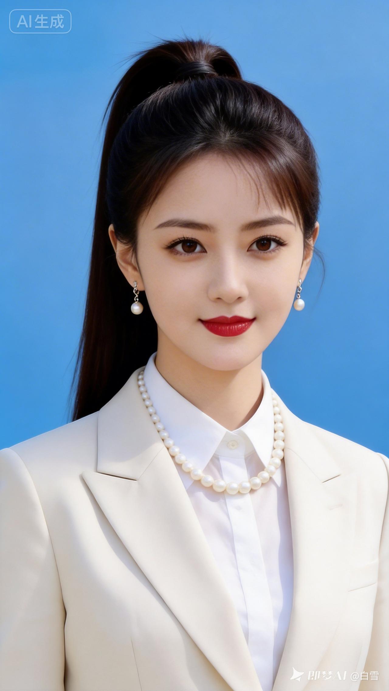 身着浅色西装套装,内搭简约白衬衫,利落高马尾尽显干练。大眼睛灵动有神,高鼻梁精致