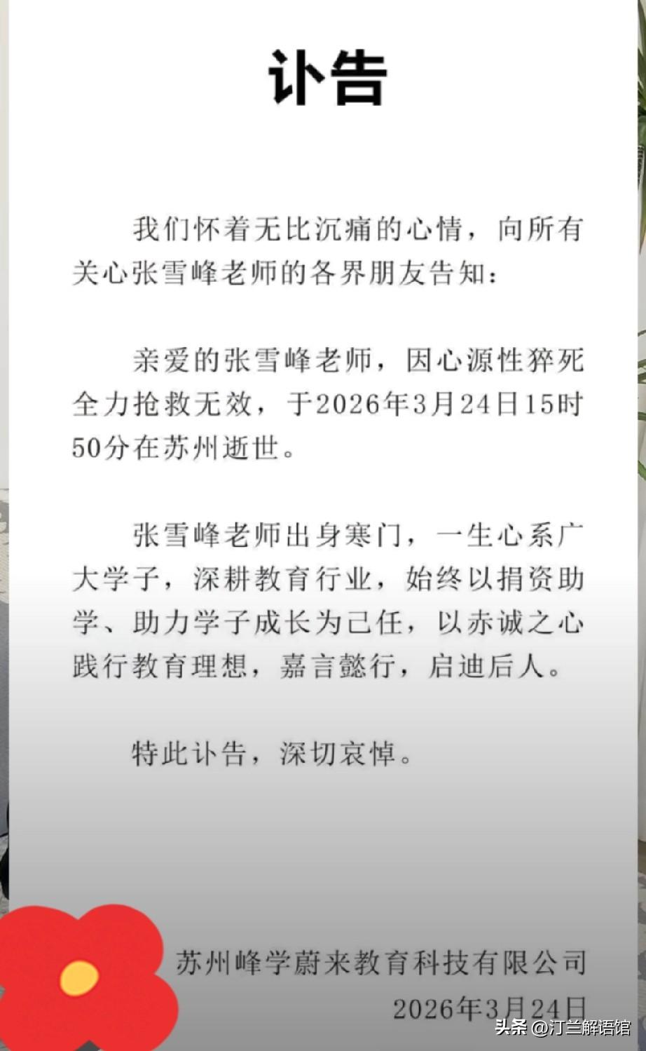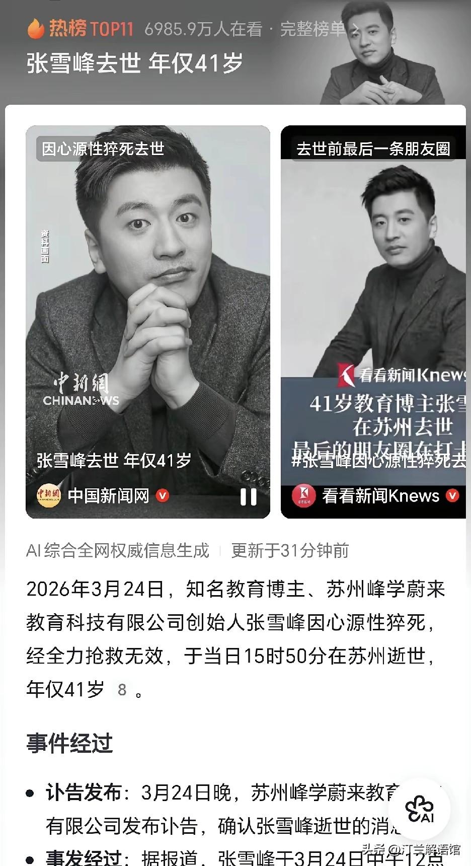 悼张雪峰:一生燃尽为他人指路,却忘了给自己留一盏灯 文 / 订兰解语馆 作为一路看着他走来的同行,得知噩耗的那一刻,满心都是扼腕与心痛。他用最尖锐直白的话,点醒无数迷茫学子,帮万千家庭规划前路,自己却在人生的赛道上,拼到油尽灯枯。 他从不是不懂身体的预警,住院、不适、旁人一次次提醒,都在劝他停下,可他心里装着太多学生与事业,硬是扛着高压连轴转。本想靠跑步自救,却选错了方式,终究没能躲过这场猝不及防的离别。 身家过亿又如何,声名鹊起又怎样?没了健康这个根基,万般繁华皆成空。他曾笑言渴望猝死,不愿被病痛拖累,却以最令人心疼的方式,印证了健康才是人生唯一的底牌。 他的离去,不该只是一代人的回忆,更该是所有人的警醒:别用透支生命去换功成名就,人生从不是短跑冲刺,细水长流才是长久之道。 福禄有定,知足常乐,慢一点、稳一点,远比拼尽全力燃尽自己更有意义。愿天堂再无奔波与劳累,张雪峰老师,一路走好,也愿世人都能以此为戒,惜命、惜福、惜当下。张雪峰简历
