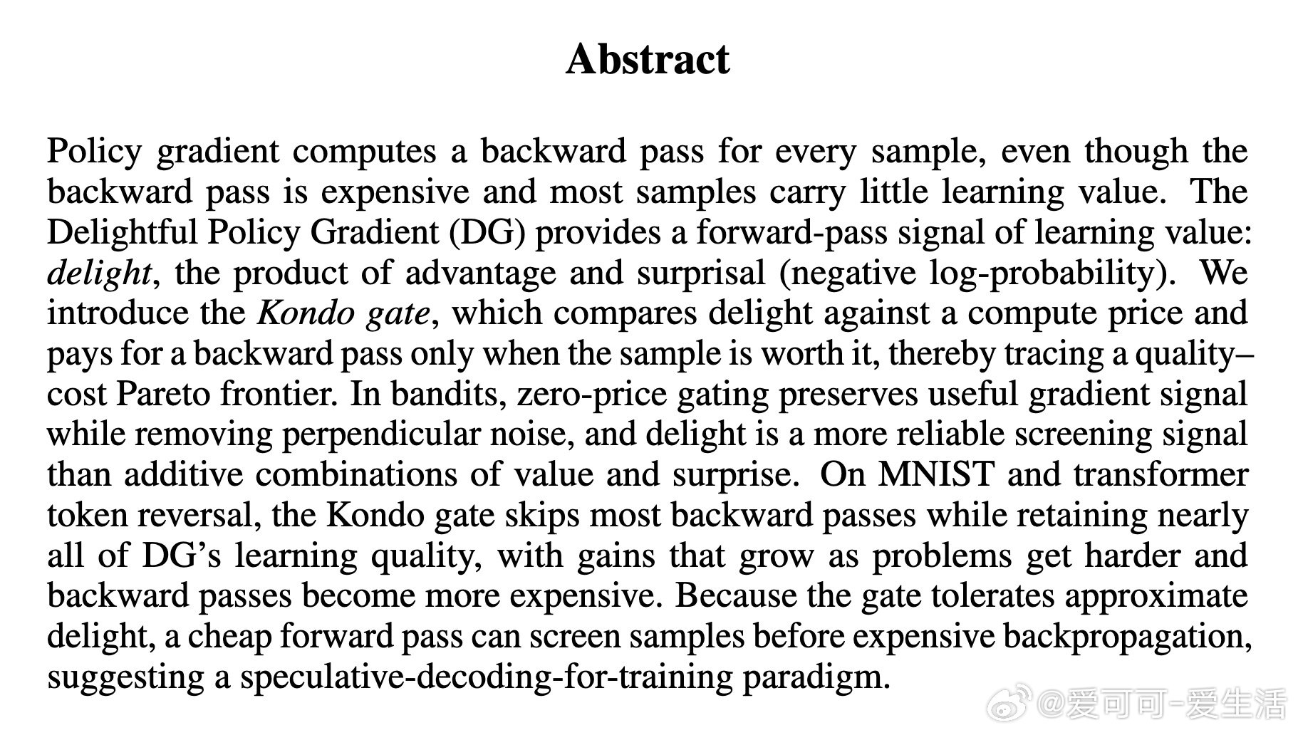 本文的核心洞见是:把"是否值得反向传播"重新看作一个可在前向传播阶段做出的决策。关键在于"喜悦度"这一信号——优势值与惊讶度的乘积,仅凭前向传播即可获得。由此,Kondo门将喜悦度与一个算力价格比较,只对值得学习的样本触发反向传播,在学习质量与计算成本之间划出一条帕累托前沿。