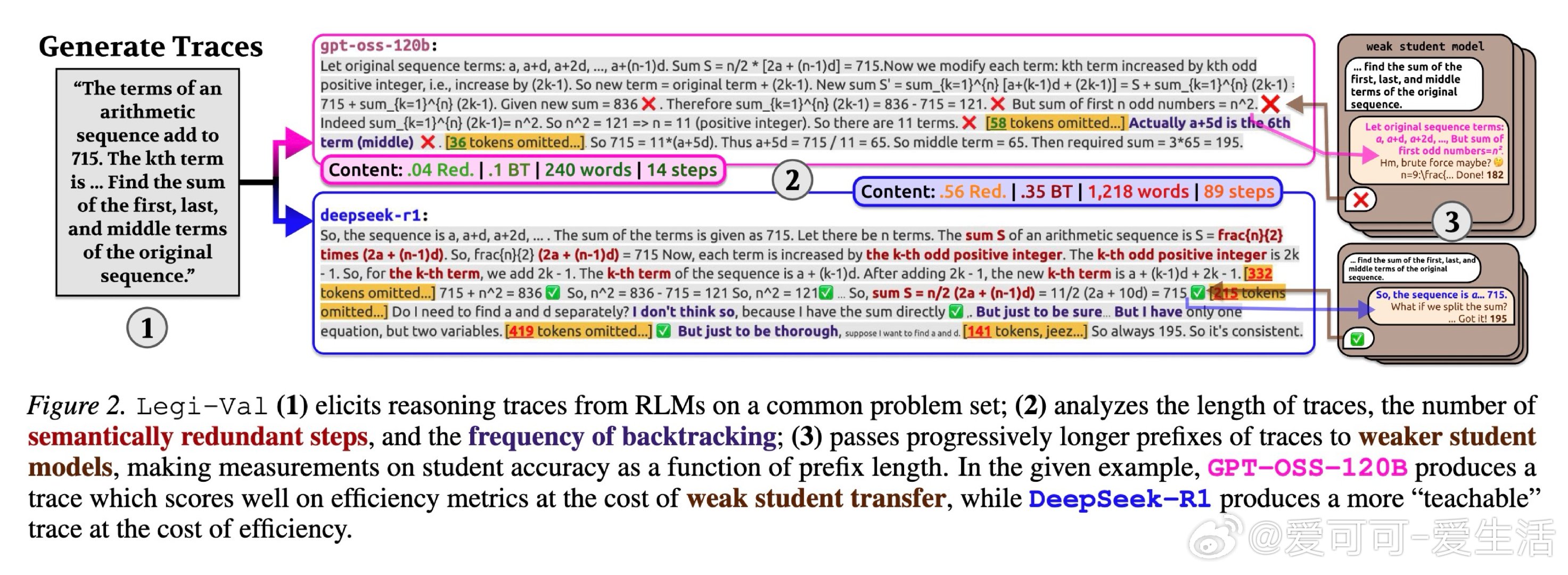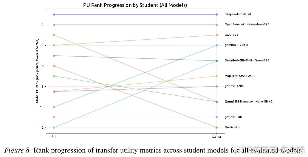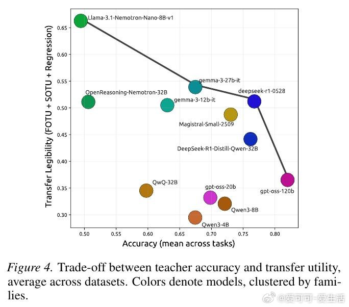 本文的核心洞见是:把"推理痕迹能否被教会"重新看作一个独立的可量化目标。由此,"迁移效用"这一操作应运而生——让弱模型逐步接收强模型推理链的前缀,以弱模型答题准确率随步数的变化曲线,衡量推理链的可教性而非仅衡量其简洁程度。跨12个模型、近10万条痕迹的实验揭示:准确率最高的模型(82%)在迁移效用上排名倒数第二,而准确率最低的模型反而教学效果最佳。