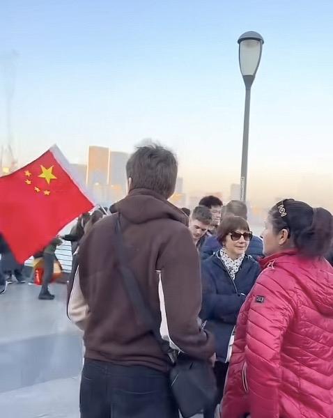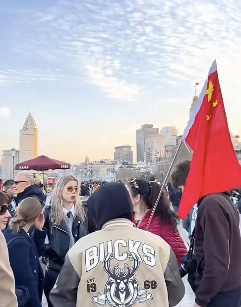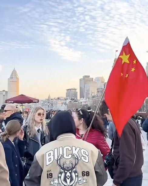 外滩这一幕, 看得人热血沸腾 金发碧眼,手举五星红旗, 笑得比外滩为灯光还亮。