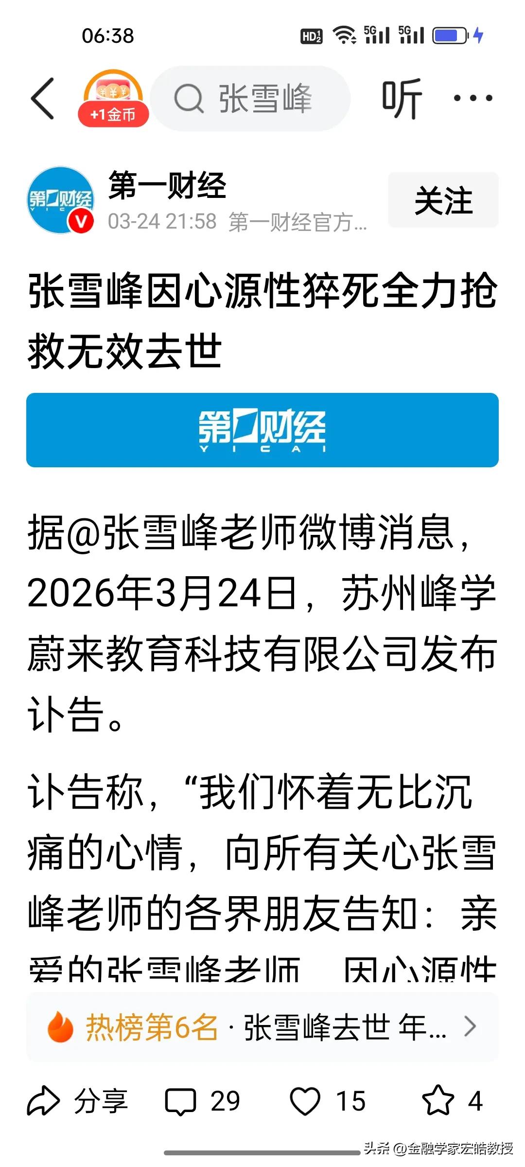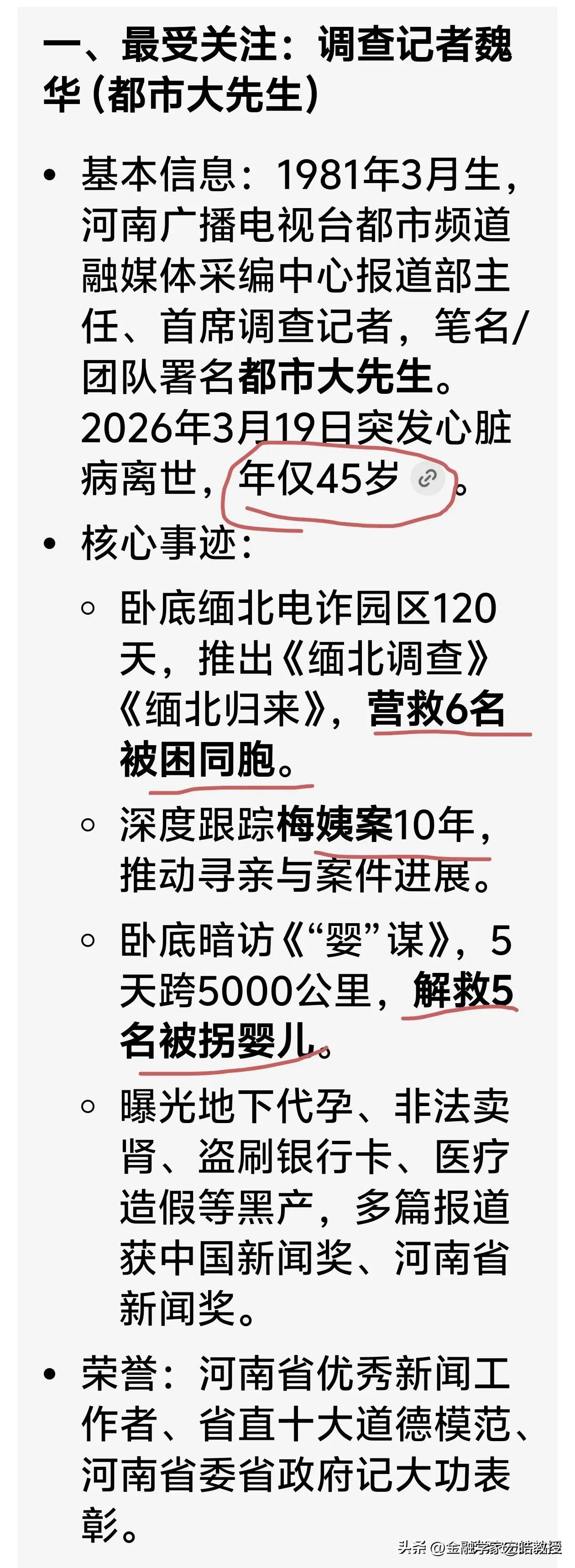 五天内,接连两位80后离世,张雪峰,魏华的突然离世提醒我们,80后已经不是年轻人,真的要注意身体了! 看下图,著名调查记者“都市大先生”魏华于3月19日深夜因突发心脏病抢救无效离世,终年45岁。跟魏华相隔了五天,考研名师张雪峰心源性猝死,41岁,实在太痛心了。两个人的相似之处在于都是80后,且都干了这么多好事,很多人想不通为什么好人不长寿? 其实答案很简单,记者和公司老板这两个职业都是工作压力如山,睡眠长期不足,常年连轴转的高强度工作,让紧绷的神经和透支的身体再也扛不住重压,负面情绪也无处安放,最终酿成了无法挽回的悲剧。 80后早已扛起了家庭与社会的双重重担,上有年迈父母需要照料,下有年幼孩子等待陪伴,身体才是所有责任与热爱的根基,务必学会慢下来、爱自己,跑得快不一定能到终点,还是要做长期主义者。