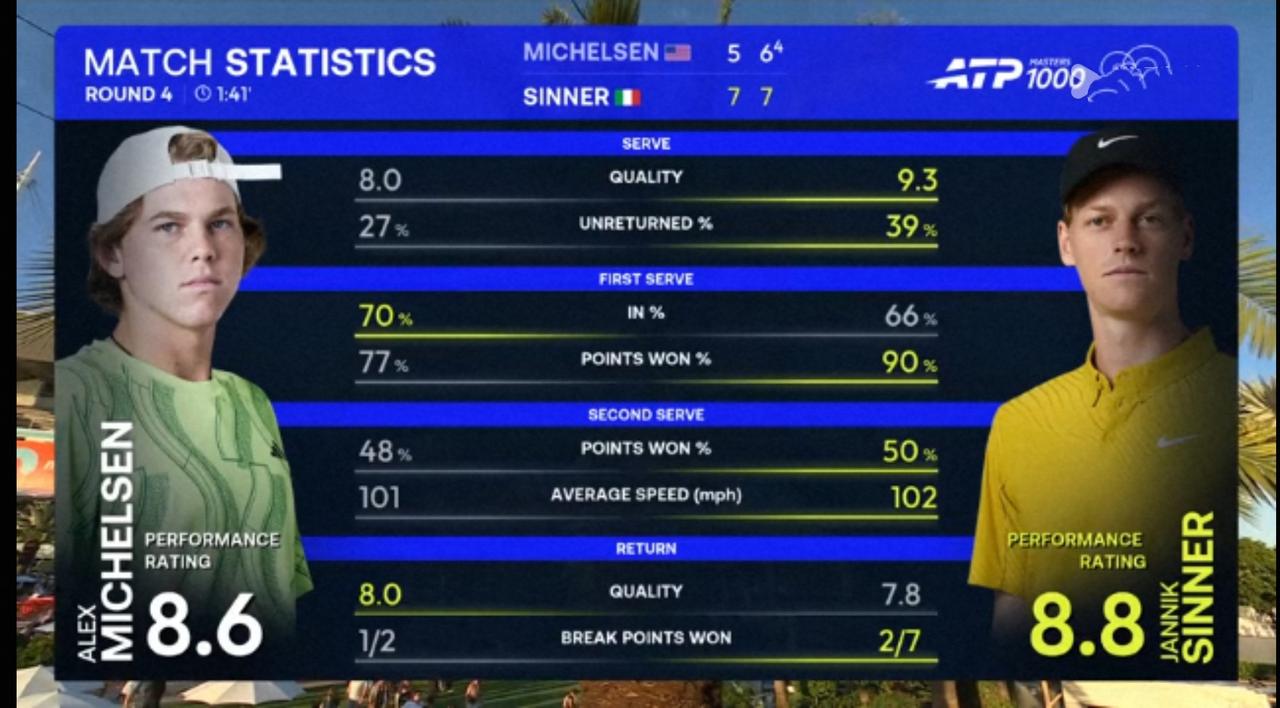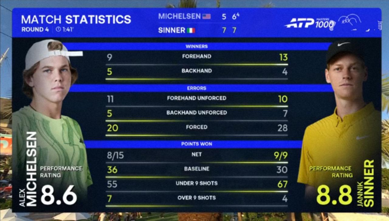 辛纳迈阿密大师赛1/8决赛比想象的艰苦得多 北京时间2926年3月25日早上,迈阿密大师赛1/8决赛,世界第二辛纳对阵美国本土选手米克尔森。 结果,苦战两盘,辛纳以2:0的比分完胜米克尔森,晋级八强。 具体比分为7:5、7:6(4)。 这场比赛,精彩程度和艰难程度远超球迷们的预料,比赛呈现出“强强对抗”的局面。 第一盘。前十局各自保发,转折点发生在第十一局,米克尔森被逼出连续两个破发点,随即遭遇破发,可谓大意失荆州,5:6。第十二局,辛纳发球胜盘局,仅丢一分,顺利保发。 7:5,辛纳拔得头筹。 第二盘。前五局各自坚守住自己的阵地。第六局,米克尔森逼出连续两个破发点,随即兑现破发,4:2。第八局,辛纳非保不可发球局,仅丟一分,顺利保发,3:5。第九局,米克尔森发球胜盘局,被逼出连续两个破发点,随即遭遇破发,5:4。随后各自保发,比分来到6:6。 抢七,3:3交换场地,4:4后辛纳连得3分,拿下抢七局。 7:6(4),辛纳再下一城。大比分2:0,辛纳完胜米克尔森,晋级四强。 整场比赛,辛纳共轰出15记ACE,比对手多12记;一发得分率高达99.48%,比对手高出13个多百分点;二发得分率50.00%,比对手高出近3个百分点;共拿到7个破发点,比对手多5个;成功破发2次,比对手多1次;总得分71分,比对手多9分。 这场比赛,争夺十分激烈,比分非常胶着。米克尔森表现神勇,多拍对攻中不落下风,相持中给辛纳制造了不少麻烦,也获得了胜盘机会,遗憾的是关键时刻出现波动,给辛纳可趁之机。 由于这场比赛的胜利,辛纳将自己与米克尔森的交手战绩改写为4胜0负。