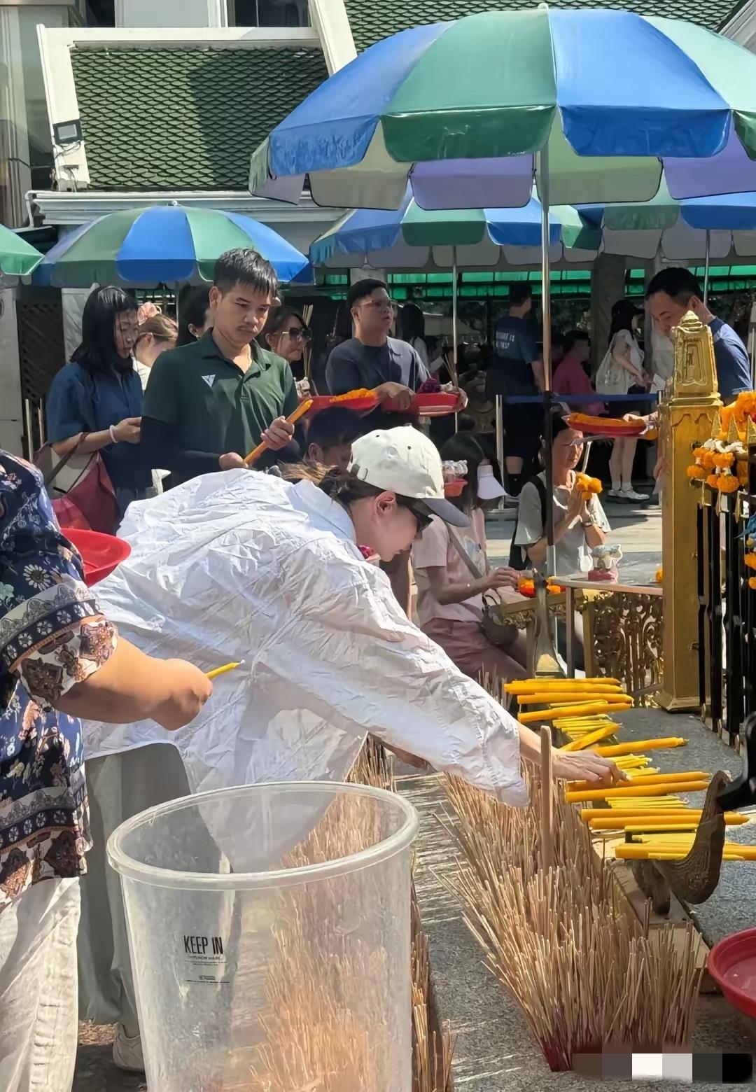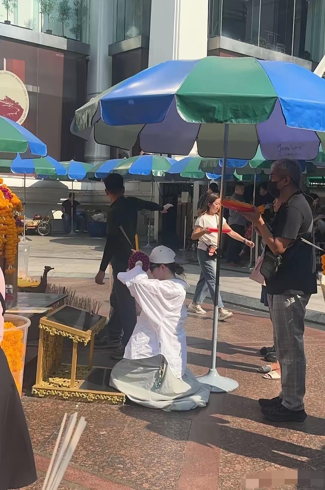 戚薇李承铉现身曼谷,戚薇身穿白色衬衣,头戴白色棒球帽,在佛前许愿,跪地虔诚祈祷,