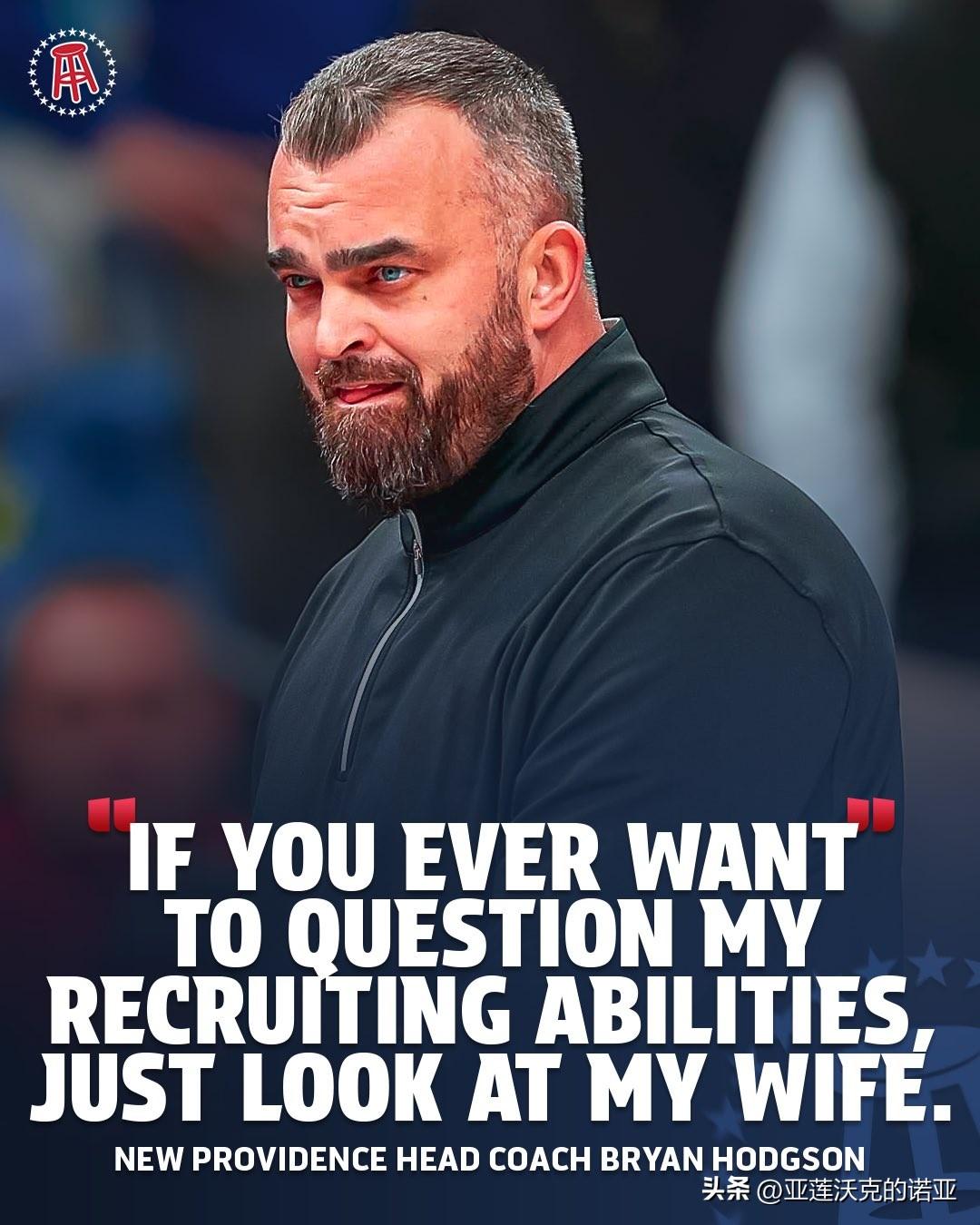 普罗维登斯学院新主帅Bryan Hodgson在介绍发布会上最幽默的一句话,2026届招生 如果你哪天想质疑我的招募能力,只要看看我老婆乔丹Jordan就行了。他还向队内球员喊话,如果你们选择离开普罗维登斯学院,我敢向你们保证,不出四五个月,你们绝对会后悔当初的决定。