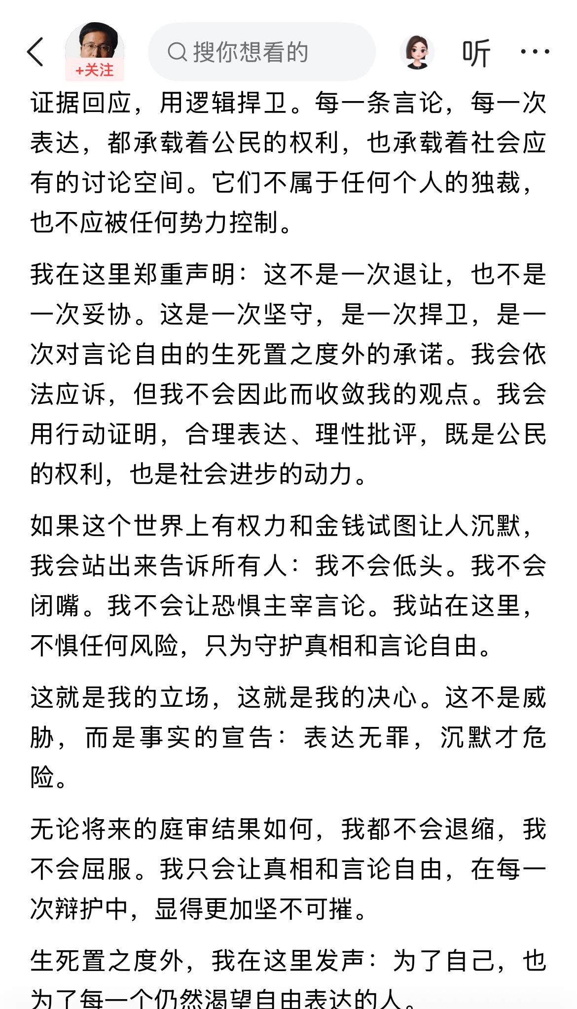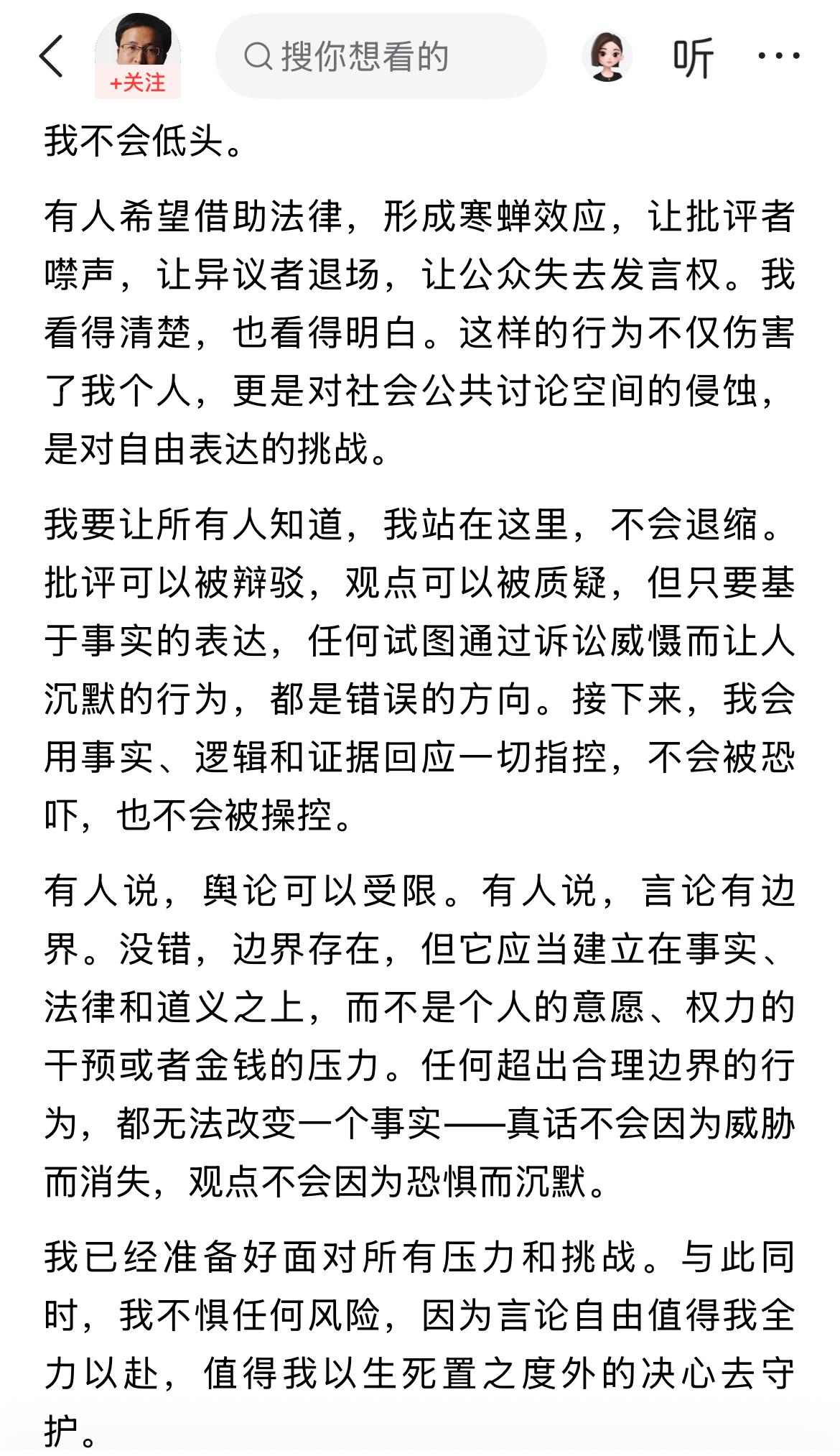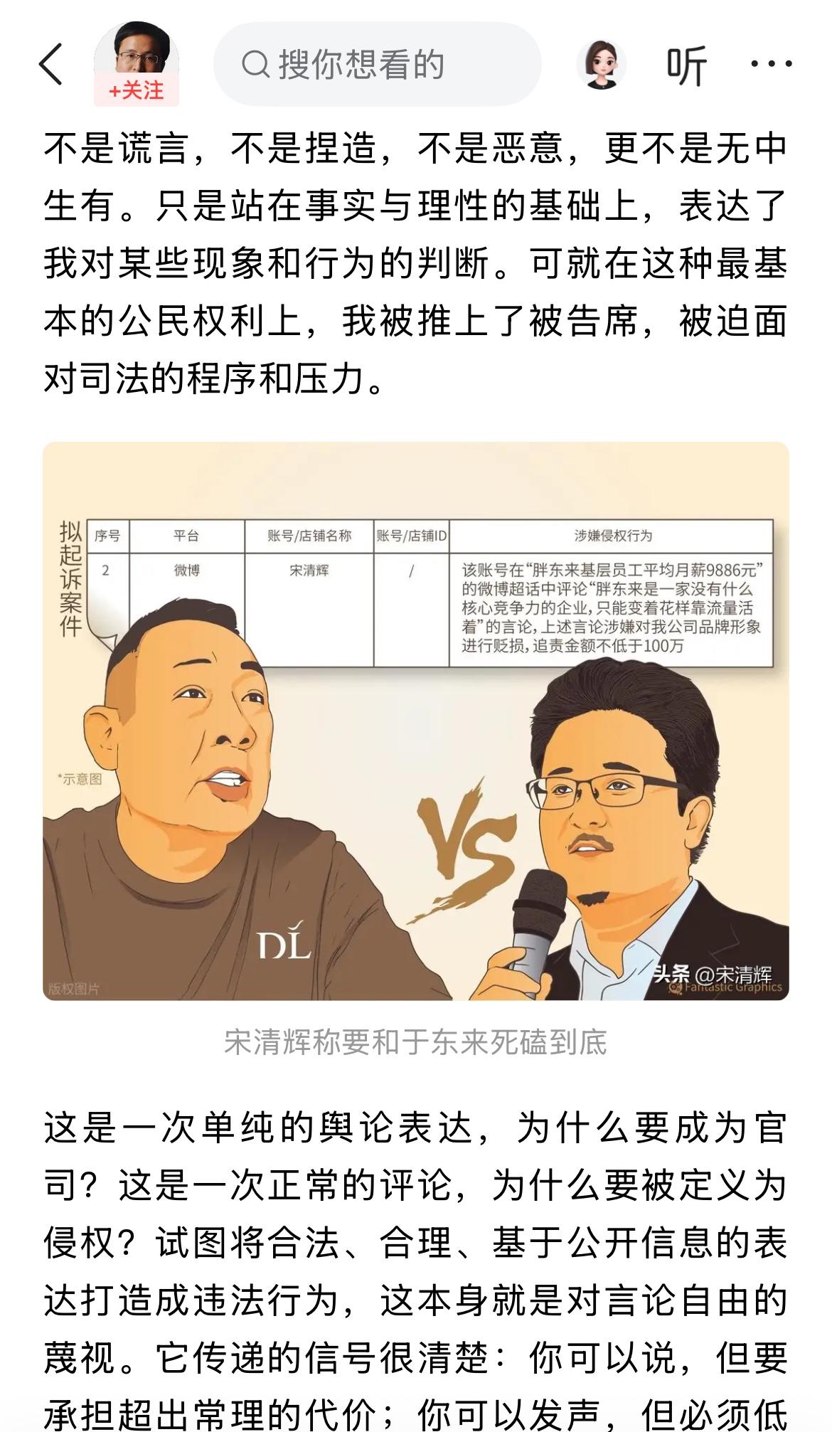 著名经济学家宋清辉继续硬刚网红超市!! 宋老师太狠了,毫无畏惧啊,就是牛。 他认为,自己被网红超市起诉; 就是因为自己说了大家都不敢说的真话。 宋老师称,自己已经收到了法院的通知书。 但是,他搞不懂,自己并没有造谣,非恶意,非谎言; 为何被告上法庭,原因只有一个,就是自己说了几句真话。 不过,他不会妥协,一定会干到底。 厉害了,宋老师。 但我还是劝宋老师私下和解。 因为你没他有钱,没他有地位和影响力。 干不过的,有时候还是要认输啊,认识自己很关键。 你怎么看宋清辉被网红超市起诉,有何看法呢?