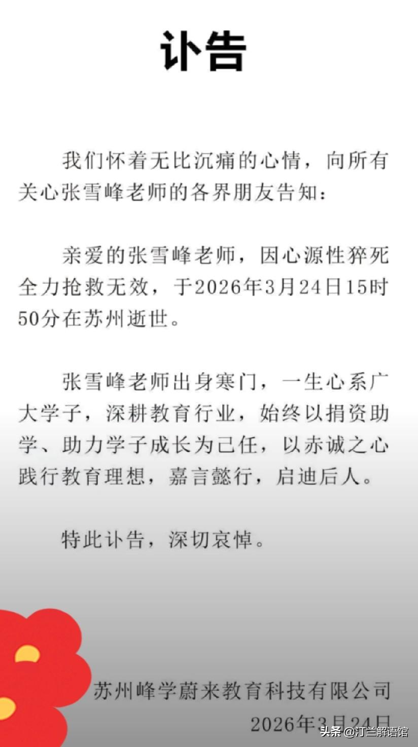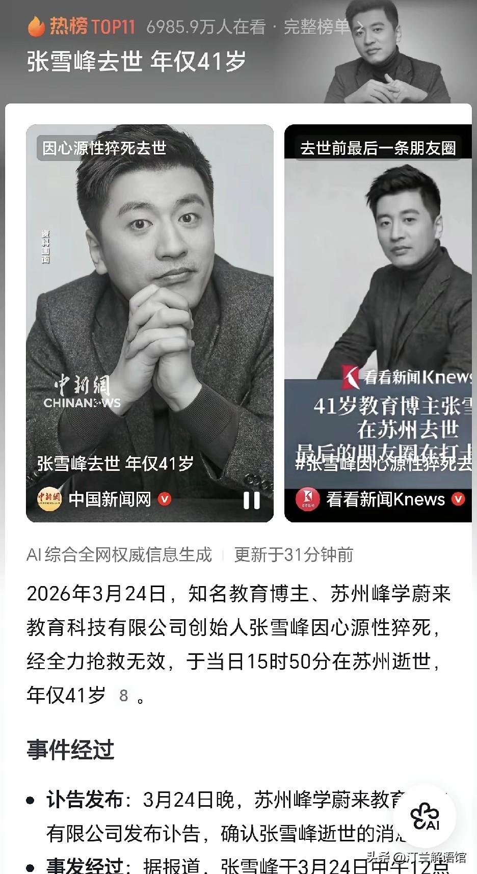 早上4点多一醒来,打开手机就刷到张雪峰老师离世的消息,瞬间痛心不已。这么好的一个人,年仅41岁就匆匆离去。他在苏州创立峰学未来,深耕升学规划领域,用专业与真诚,打破教育信息差,帮无数普通家庭和寒门学子找准高考、考研方向。他常年坚持公益助学,向郑大捐赠300万,哈理工捐赠100万,持续资助家乡与各地贫困新生,累计公益捐赠近千万,默默守护万千学子求学路。他敢说真话,心系学子,功劳与善举有目共睹。张老师,一路走好,您太累了,愿您安息。🙏教育大v张雪峰 张雪峰采访视频