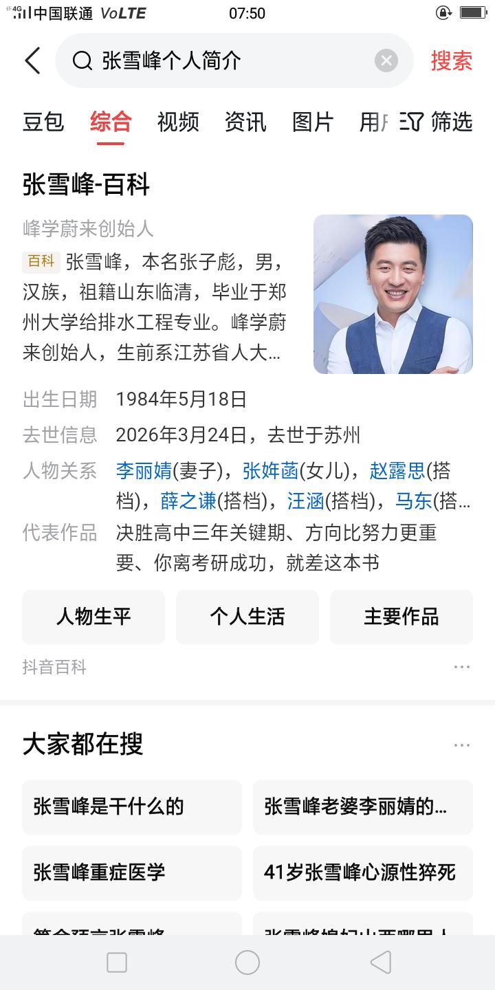 3月24日,张雪峰去世,年仅42岁,死于心源性猝死! 我今天打开微信,看到张雪峰去世的消息,我以为这个人不是他,真没想到是他!这个敢为穷人发声的东北男人,永远的走了! 2026年高考的学生,还在等着他呢,还有无数个高考的孩子,失去了张雪峰但是我们还可以看他往日的视频。 有很多的专业真的不适合穷人,你终于知道了为啥有的人只需要一个文凭了,他们只是在等一个机会,有机会了他们就可以去正式单位上班了~ 因为我表姐就是,舅舅在银行上班,她先读初中,中专,大专,又读本科,后来在家待了好几年,又去了银行上班直到现在~