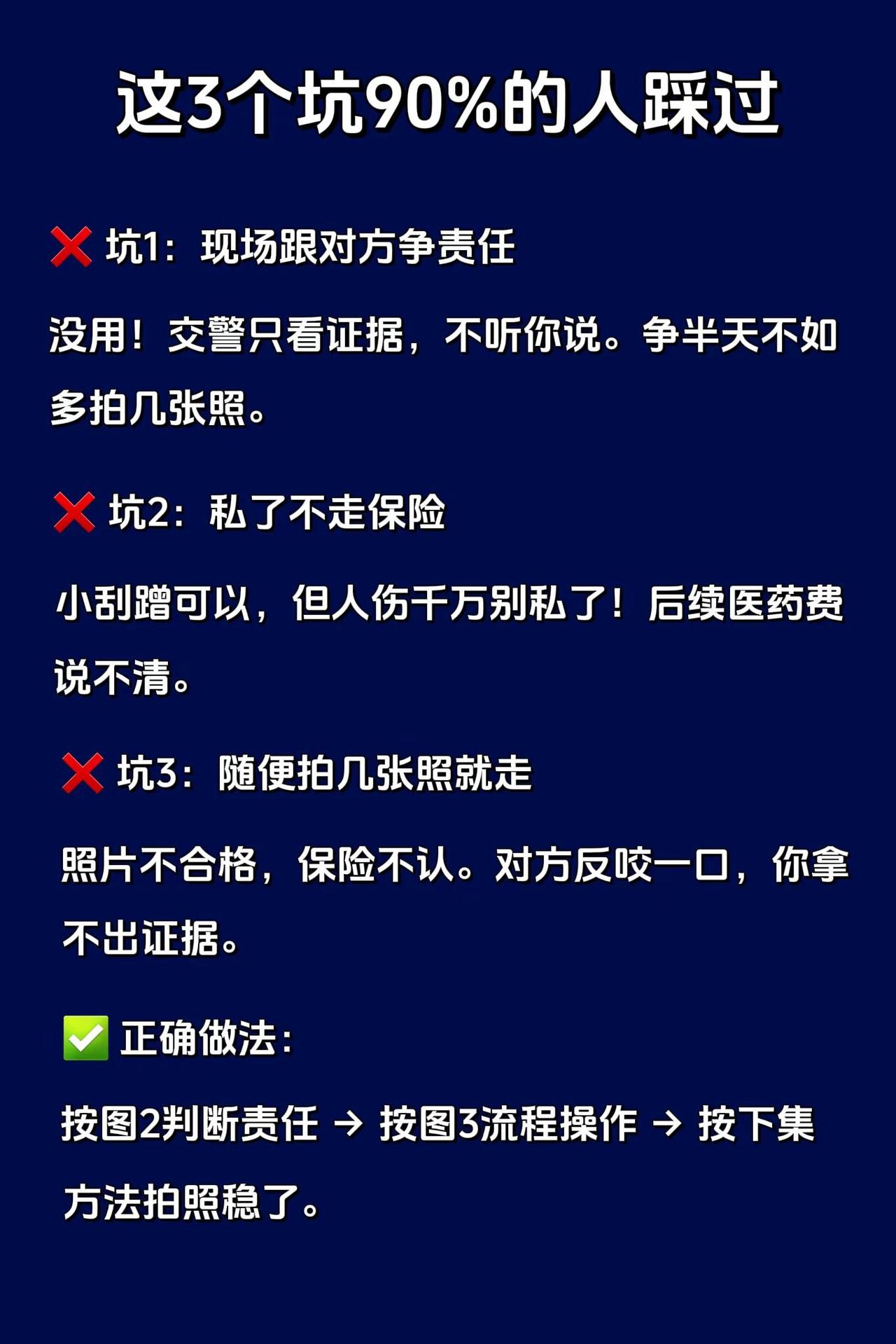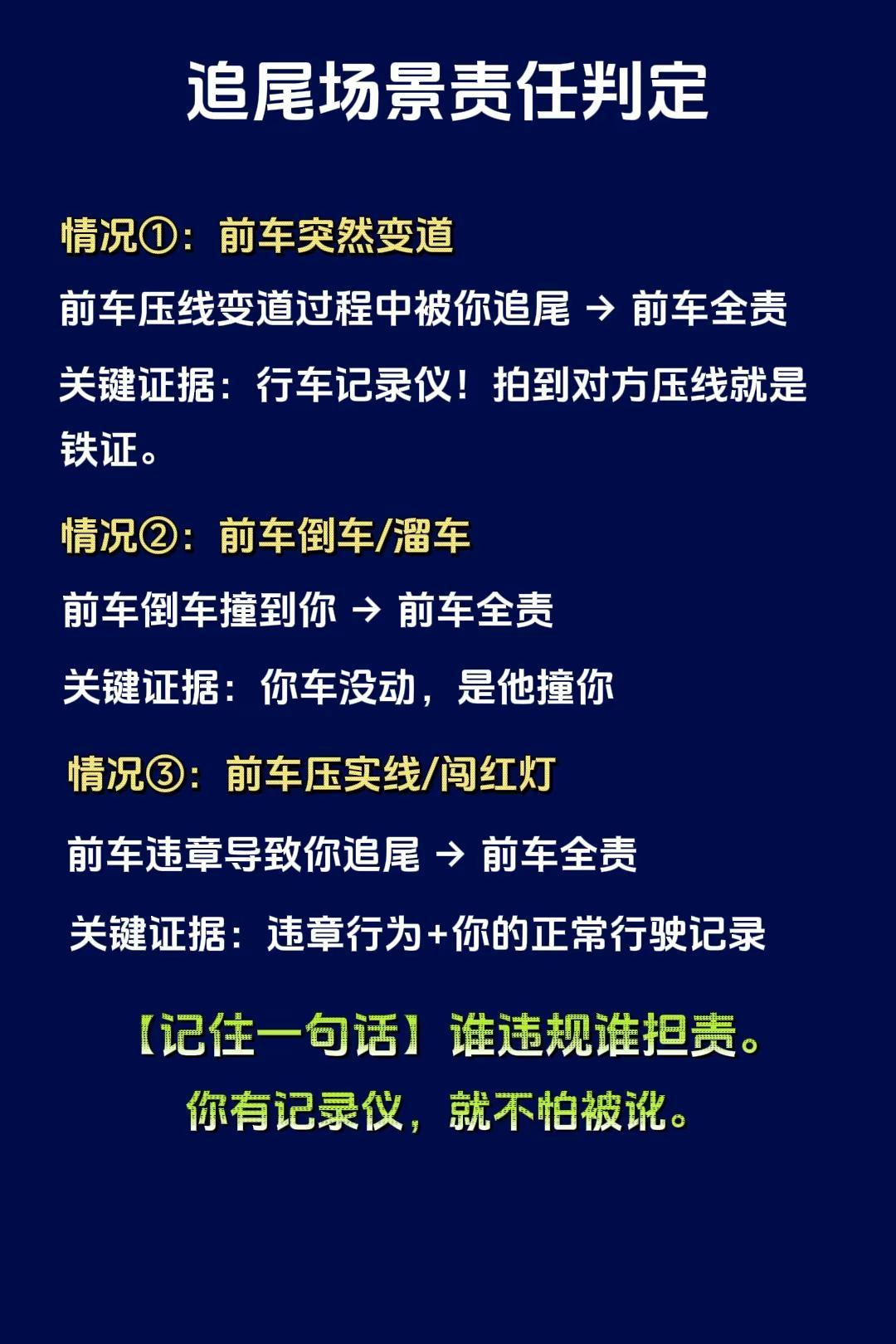 这3种情况你全责,别乱认!很多人以为“追尾就是后车全责”,其实这3种情况不是:①前车突然变道/压线 → 前车全责②前车倒车撞你 → 前车全责③前车闯红灯/压实线 → 前车全责记住:谁违规谁担责。有记录仪就不怕被讹。发生事故先打双闪放三角牌,拍完照再挪车。拍照前别挪!否则责任说不清。⚠️下集讲《交警认可的5张照片》,点我主页看合集。用车知识 剐蹭处理 交通事故 新手司机