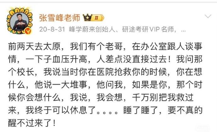 其实看下来真的挺唏嘘的。 很多人说他是跑步出事,其实大家都错了,他真正的死因是:死于长年累月的劳累和精神高压。名下十几家公司,9家法人,要管业务、养团队、扛营收,背后是一整个摊子的生计。 再加上他做的又是教育咨询这种风口浪尖的行业,考研季、高考季这种高强度时段,是一刻都不得休息。再说了,他这个人在网上什么话都讲,该讲的不该讲的,他都往外说,造成很大的舆论,无形又增加了他的压力。 外表看着风光无限,内里早就像拉满弓的弦,绷得太紧太久。才41岁,说没就没了,外人看是名利双收,只有他自己知道,活得有多累。这一生到底是值还是不值,真的很难说清。 张雪峰张雪峰去世 年仅41岁