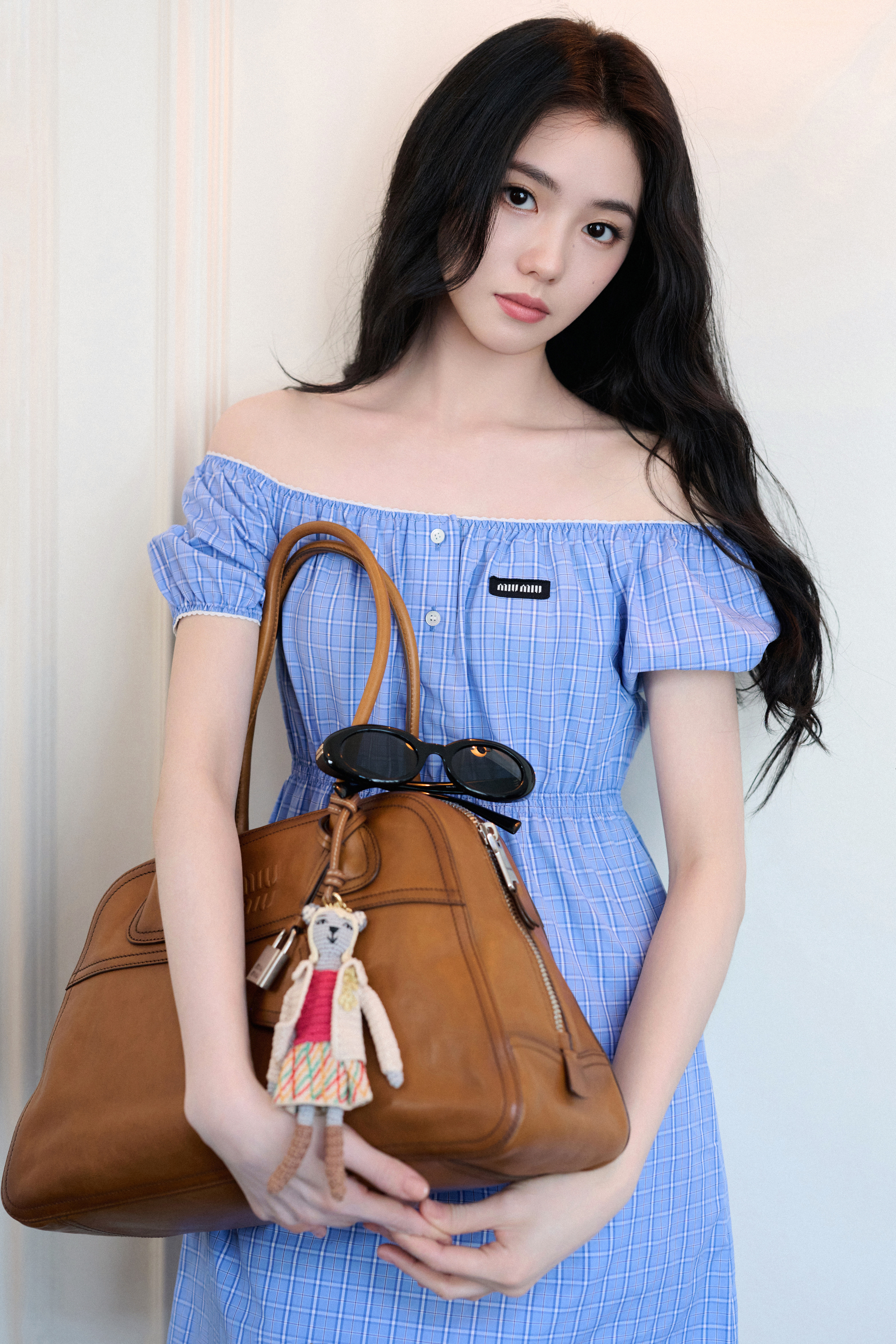 刘浩存更新动态并晒出清纯美照,身着蓝白格子的露肩连衣裙,长发披肩,双腿交叠,脚上