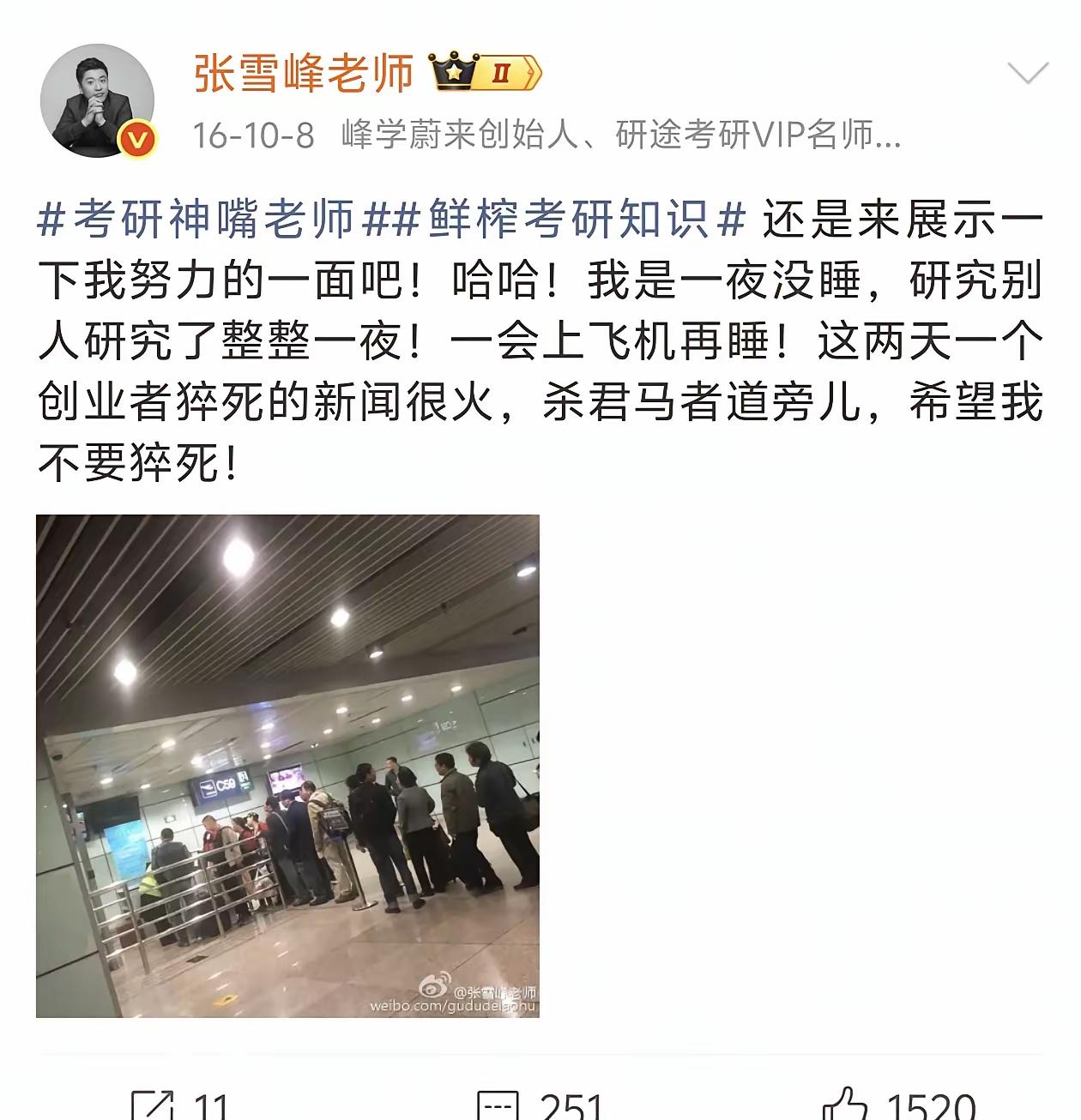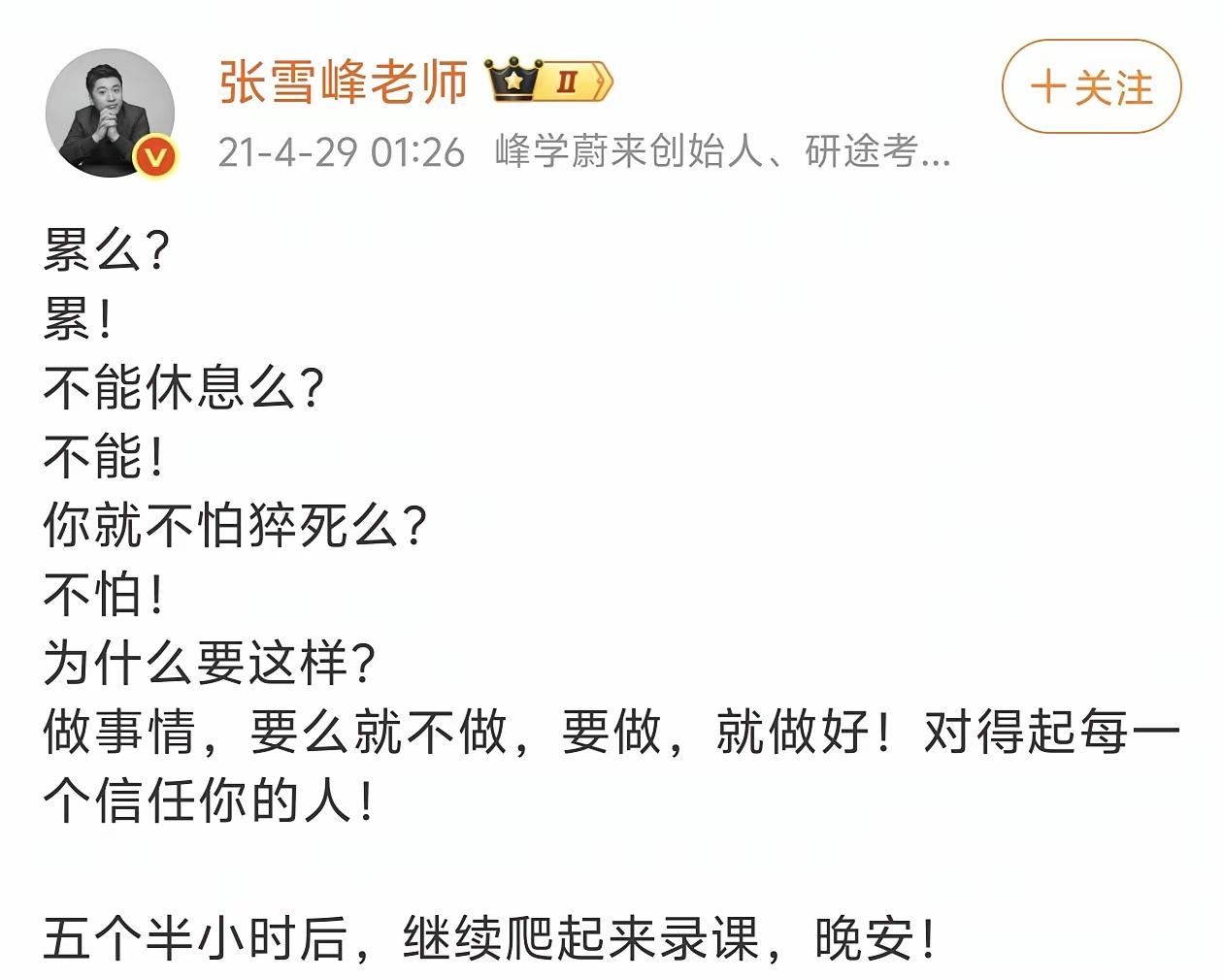 知名教育博主张雪峰离世给所有人的启发! ①不要把“死”“猝死”挂嘴边,可谓言之而不预,口乃心之门户。经常说猝死,很容易成真,翻开他历史记录从16到21年几乎年年说两个字,潜意识希望这样的结局,结果... ②企业做大一定建设员工食堂。老一辈工作都有食堂,员工求职也问包吃包住不?为了员工利益一般都选择建设员工食堂,雇佣一个做饭的,虽然不好吃但是干干净净,对健康有好处,对自己和员工都有益处,即便不具备条件,估计员工自己带饭,多购买几个微波炉,从健康角度还是重视饮食安全。 ③人过四十不要激烈运动。不年轻了,运动是好事,要量力而行,不要高强度,看看张雪峰朋友圈的运动量确实很大,要是20多岁没问题,40多岁的人了,要量力而行。 ④量力而行不要太累。十几家公司,这确实要打点,缺乏职业经理人,尤其直播强度很高,睡不好,加班熬夜,都是致命的,珍惜身体健康,发现嘴唇发乌,就要注意。 大家好好照顾好自己吧,希望人生经常,但是也要注意身体!