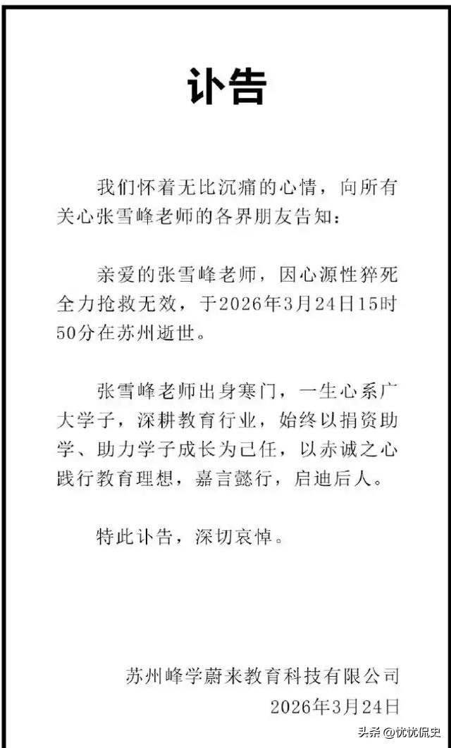 张雪峰因心脏骤停去世了!当这条消息在3月24日下午突然刷屏时,无数网友的第一反应是:造谣的吧? 毕竟那个说话语速飞快、自带东北人爽利气场的男人,前不久还在直播间为考生梳理志愿、帮家长排忧解难,怎么会说没就没了?41岁本是事业深耕、精力正盛的年纪,这般突如其来的离别,任谁都难以接受。 没人愿意相信,直到合伙人一句“无可奉告”、助理沉默不语,直到他抖音、微博等多平台账号头像骤然变成黑白,原本排满的直播活动全部停摆,一切才终于有了冰冷的答案。苏州峰学蔚来教育科技有限公司的讣告最终敲定:3月24日中午12点26分,他在公司跑步后突发不适,被紧急送医;下午3点50分,经全力抢救无效,因心源性猝死在苏州离世。 消息落地的瞬间,评论区瞬间被两种情绪填满。一边是密密麻麻的“求辟谣”“不可能”,无数粉丝反复刷新页面,盼着这只是一场乌龙;另一边则是满屏的感谢,有人说“高考志愿全靠张老师,才选对了能就业的专业”,有人回忆“熬夜看他的直播,终于敢放弃不喜欢的学科”,字字句句都藏着他曾带来的温暖与希望。 张雪峰的荣光,从来不是靠流量堆砌的虚名。他出身寒门,最懂普通家庭的焦虑与无奈——父母一辈子攒钱供孩子读书,却被复杂的志愿规则、信息差挡在门外。他用最接地气的语言,击穿教育领域的信息壁垒,把“选专业要匹配就业、要贴合家庭实际”的真相,掰开揉碎讲给普通人听。 他曾直言“深圳职业技术大学是专科里的小清华”,为高职高专正名;也会在直播间里反复叮嘱,普通家庭的孩子,优先选能快速落地、养活自己的专业。这份“功利”,实则是他站在底层视角,为无数寒门学子铺就的逆袭之路。 可争议,也始终与他如影随形。那句“文科都是服务业”的极端表述,曾引发全网哗然,被批贬低人文社科;点评西南大学的“兽医论”、劝家长“打晕孩子别报新闻学”的言论,更是将他推上舆论风口,引来学界与网友的双重质疑。 但很少有人深究,这些争议背后的初心。他从不是否定文科的价值,只是提醒普通家庭,在生存面前,理想需要让位于现实;他的每一句“犀利”,本质都是替囊中羞涩的父母,算一笔最划算的教育账。 争议与荣光,终究都成了过往。他用一张嘴搅动整个教培圈,让无数普通家庭看到了教育改变命运的可能;也因过度劳累,在2023年就曾因胸闷心悸住院,让粉丝揪心不已。如今他骤然离去,留下的不仅是教培圈的震动,更是对当代人健康与教育选择的深刻反思。 他的一生,是普通人奋斗的缩影——有锋芒,有争议,有坚守,有遗憾。41载人生,他活成了无数人生命里的“引路人”,也让我们看见,教育的本质,从来不是空谈理想,而是让每个普通人都能找到属于自己的出路。 各位读者你们怎么看?欢迎在评论区讨论。