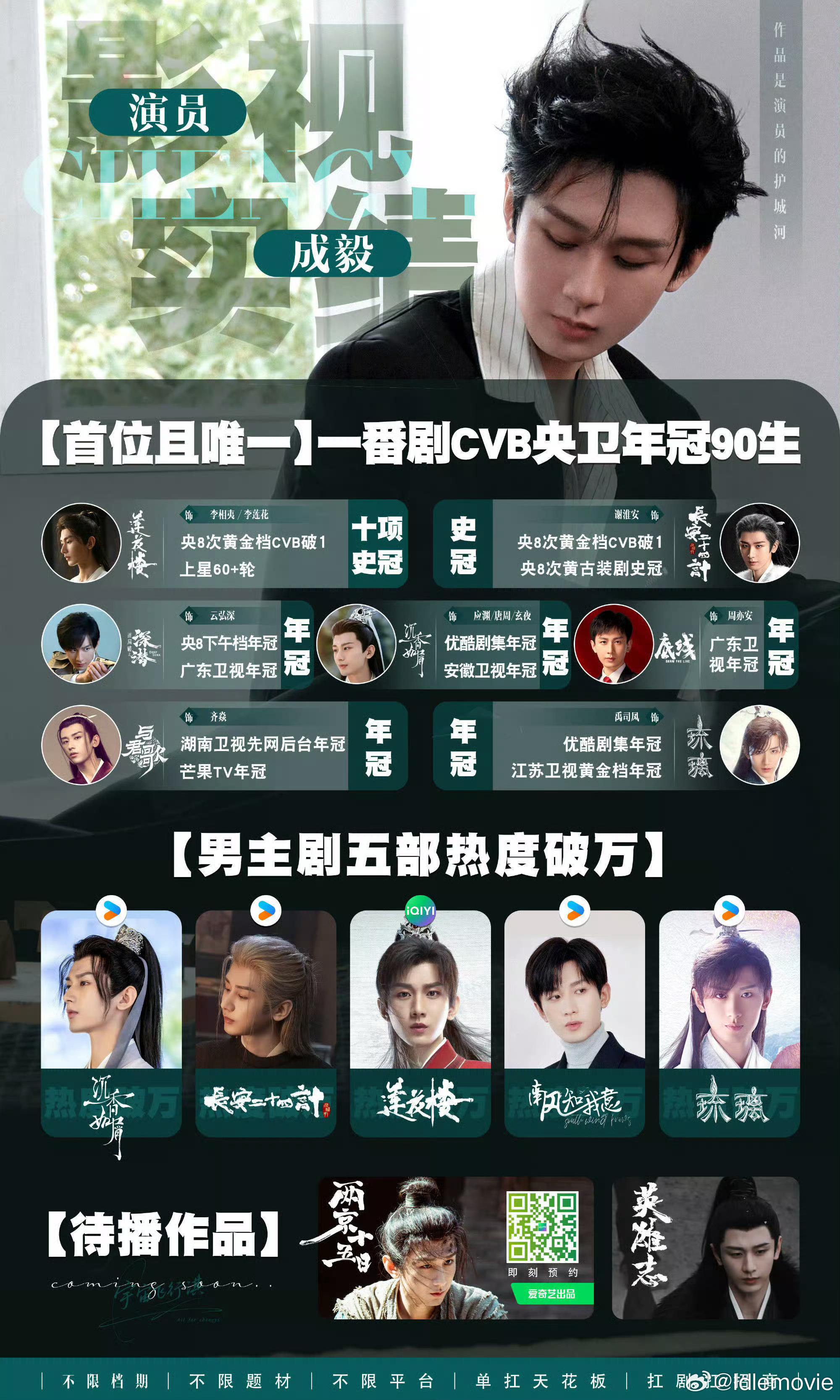 正因为这份敬业专业让成毅手握8部爆款,部部全网曝光破百亿,男主剧5部热度破万,四个月三个角色个个热度破亿,年冠拿到手软,《莲花楼》爆尾不断,足见 爆款从来不是一时的热搜,而是四面八方的观众的共同托举;出圈从来不是圈地自嗨,而是大众的喜闻乐见;实力从来不是仅粉丝可见,而是已至高山仍然精进。为成毅,再跑一百步,《两京十五日》《英雄志》不见不散。