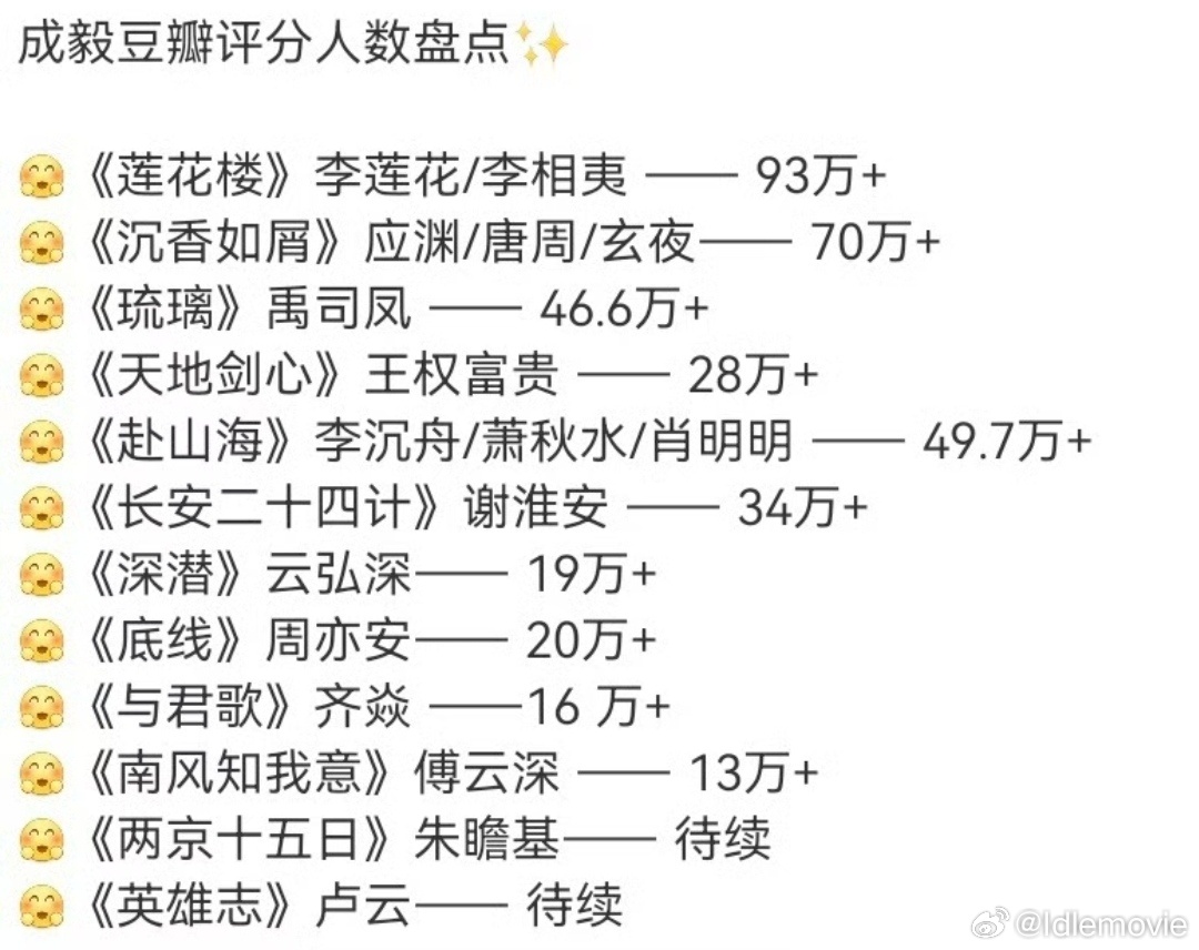 直到看见成毅作品的某瓣打分人数,我对成毅的剧粉盘和路人缘有了真实体感,《莲花楼》93万+,《沉屑如香》70万+,《赴山海》49.7万+,《长安二十四计》34万+,就连《与君歌》《南风知我意》都有十几万,那些连十万+都达不到的就别碰瓷爆款了。