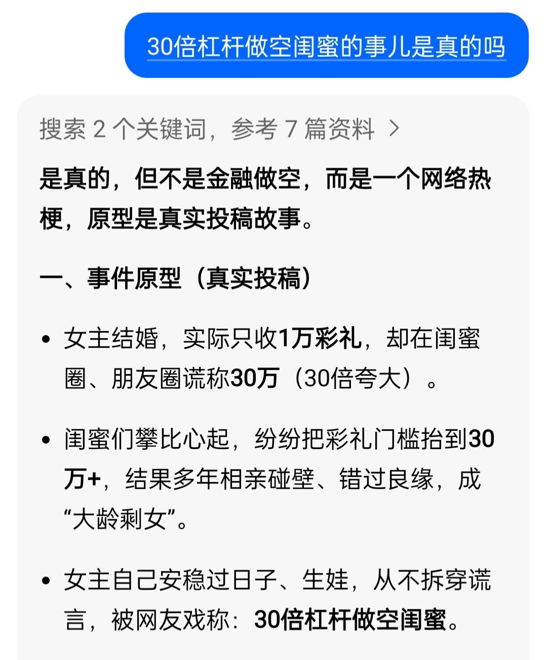 30倍杠杆做空闺蜜这事最近传的很火 ,于是我问了一下豆包事件的真实性,包居然说是真的,我还是不太相信,既然是闺蜜,那应该关系是不错的,那么他这样做的目的何在? 于是我又问了一下DeepSeek, DeepSeek认为这不是真实的新闻, 豆包看来是被忽悠了。