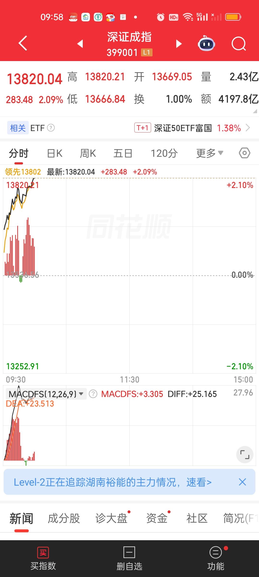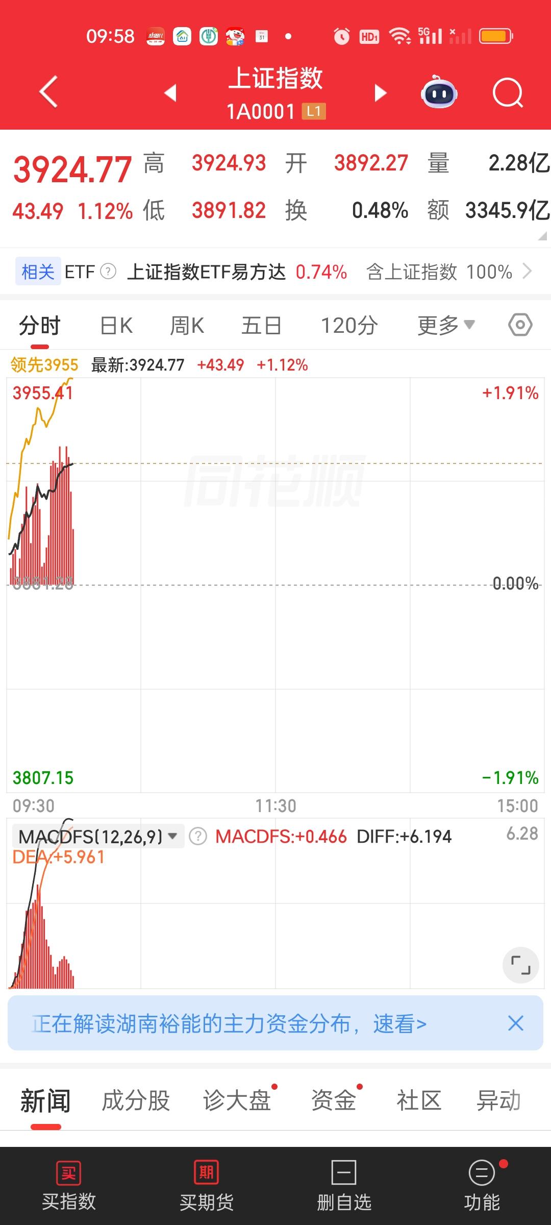 不管从哪个角度看。上午的情况还比较理想。成交量放量1200亿,大盘资金净流入接近300亿,总之一句话大家都在买买买。但我预计这种买进不会持续太长时间。还是需要提防资金迅速流出的情况。到时候指数还是很有可能下来的。现在怕的就是冲高回落。看能不能上3950,不能上还是会掉头向下。就需要减仓了。