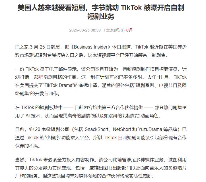 据了解,近期TikTok正在为一个短剧项目招募演员,且在海外提交了“TikTok Drama”这一商标申请。