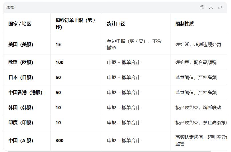 全世界对量化已有严格限制,韩国,印度股市每秒上限10笔;美股每秒上限15笔;日本股市每秒上限50笔;欧股每秒上线100笔;A股每秒上线300笔。