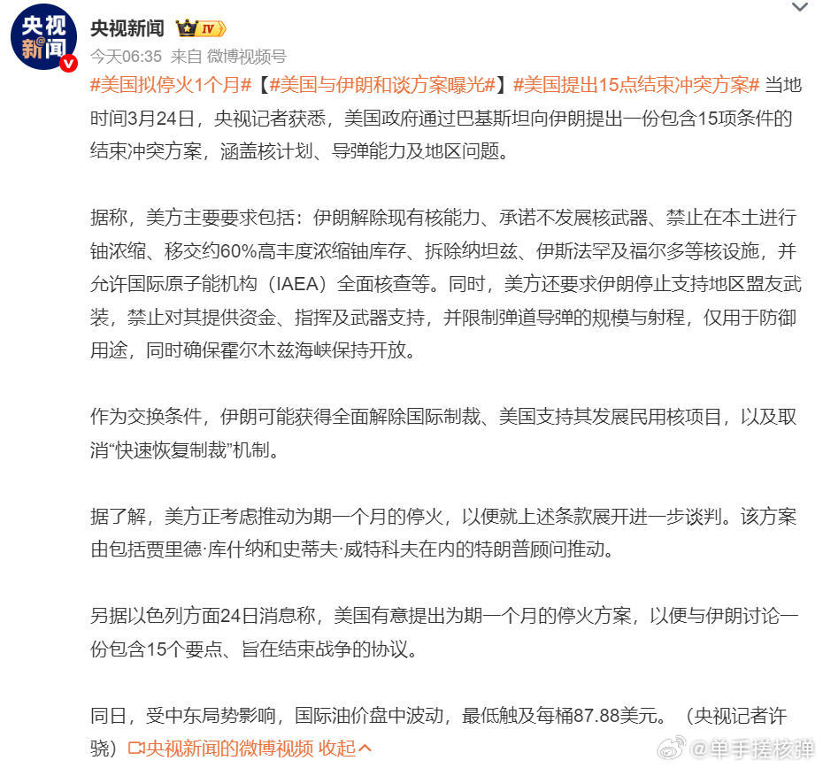 美国拟与伊朗停火1个月,谈判商讨15项“永久停火条件”!