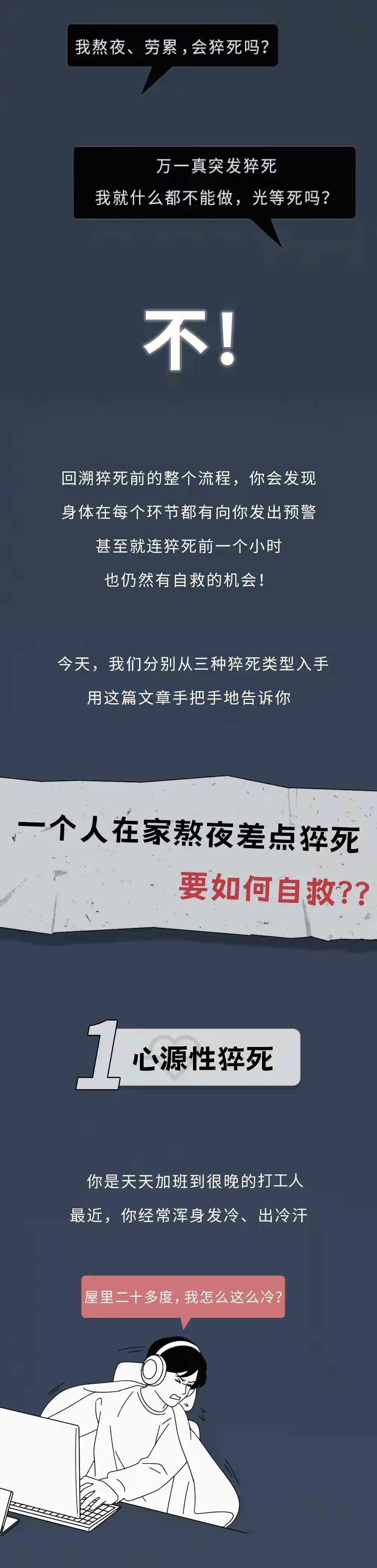 别大意!猝死前1小时,身体会发出预警 心源性猝死 肺源性猝死、脑源性猝死 是猝死发生的主要原因 许多人以为 猝死总是突然发生 其实,身体早已向我们释放了信号 哪些症状是身体在警告我们? 我们该如何自救? 很多人对猝死的认知,都停留在“毫无征兆、瞬间倒地”,可临床数据和大量真实案例早就证明,超80%的猝死案例,在发作前1小时,身体都会发出明确预警,只是大多被当成疲劳、熬夜后的小毛病,硬生生忽略,最终酿成无法挽回的悲剧。尤其是当下年轻人熬夜加班、中年人高压打拼、老年人疏于养护身体,猝死早已不是老年病,而是覆盖全年龄段的健康杀手,读懂身体的预警信号,就是给自己和家人留一条活命的机会。 先说说最常见的心源性猝死,它占所有猝死类型的70%以上,也是我们常说的突发心梗、恶性心律失常引发的猝死。发作前1小时,最典型的预警不是剧烈胸痛,而是持续性的胸闷、胸口压榨感,就像胸口压了一块大石头,喘不上气,哪怕坐着不动也无法缓解;还有人会出现放射性疼痛,痛感从胸口蔓延到左肩、后背、脖子甚至牙齿,容易被当成肩周炎、牙疼忽略。除此之外,莫名的心慌、头晕、眼前发黑,浑身冒冷汗、手脚冰凉,也是心脏在发出求救信号,这是心脏供血严重不足,心肌已经受损的表现,很多人觉得忍一忍、歇一会就好,殊不知每多忍一分钟,猝死的风险就多一分。 再来看脑源性猝死,多由突发脑出血、脑梗死、脑动脉瘤破裂引发,高发于有高血压、高血脂的人群,哪怕是年轻人,长期熬夜、情绪激动也可能诱发。这类猝死前1小时的预警,主要集中在头部:突发剧烈头痛,像是脑袋要炸开一样,伴有恶心呕吐,还有的人会出现单侧肢体麻木、说话含糊不清、走路不稳,甚至突然短暂失忆,这些都是脑部血管堵塞或破裂的前兆,一旦出现,绝不能当成普通头疼吃片药了事,耽误几分钟,就可能错过最佳救治时间。 而肺源性猝死,大多是急性肺栓塞、重症哮喘发作、急性呼吸衰竭导致,长期久坐、久卧,或是有肺部基础病的人更容易中招。它的预警信号很有辨识度:突然出现的呼吸困难、大口喘气,感觉吸不上空气,伴有胸口刺痛、咳嗽带血,还有人会突然嘴唇发紫、面色苍白,这是肺部血氧交换失灵,身体严重缺氧的表现,哪怕平时身体再好,出现这种症状,也必须立刻就医。 更要警惕的是,很多人的猝死预警,会表现为非典型症状,比如莫名的疲惫乏力、恶心反胃、腹痛腹泻,尤其是长期熬夜、过度劳累的年轻人,会把这些当成熬夜后的正常反应,倒头就睡,结果一睡不醒。曾有案例显示,20多岁的小伙连续加班一周,死前1小时一直说肚子痛、浑身没劲,同事以为是吃坏了东西,没当回事,短短几十分钟后就突发心跳骤停,再也没救回来,这样的悲剧,实在太多了。 知道了预警信号,关键时刻的自救方法,一定要记牢,这是能救命的知识。首先,一旦出现上述任何一种症状,立刻停止所有活动,原地坐下或平躺,千万不要硬撑着走路、打电话、做家务,减少身体耗氧量是第一要务;其次,马上拨打120急救电话,清晰说明自己的症状、位置,不要自己开车去医院,途中随时可能发生意外;如果身边有速效救心丸、硝酸甘油(心源性不适),可按说明舌下含服,没有药物就保持安静,等待救援。 同时也要提醒大家,猝死的根源,从来不是突发的疾病,而是长期的不良习惯:熬夜、暴饮暴食、久坐不动、长期高压、酗酒抽烟,都是在一点点透支身体,给猝死埋下隐患。别觉得自己年轻、身体好就无所顾忌,身体的预警信号从来不是儿戏,每一次忽视,都是在拿生命冒险。 我们总以为意外离自己很远,可猝死的阴影,就藏在每一次熬夜、每一次过度劳累、每一次忽略身体不适里。读懂身体发出的预警,及时止损、及时就医,才是对自己和家人最负责的态度。健康从来没有如果,只有后果,别等悲剧发生,才追悔莫及。 各位读者你们怎么看?欢迎在评论区讨论。