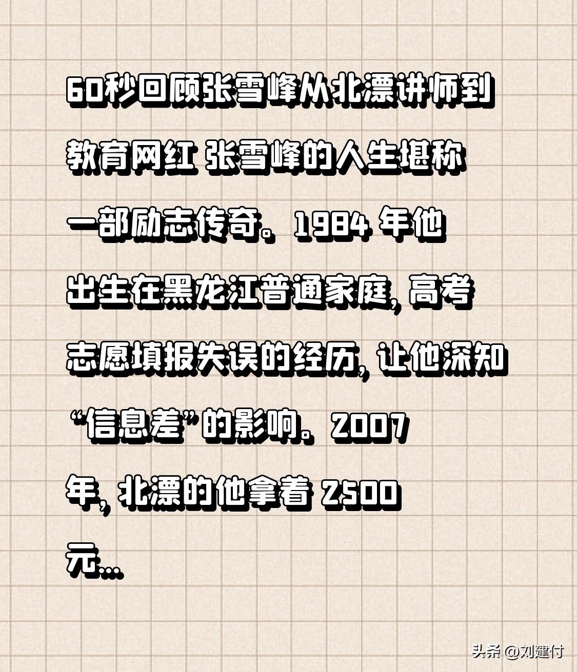 60秒回顾张雪峰从北漂讲师到教育网红 60 秒回顾张雪峰从北漂讲师到教育网红之路。张雪峰的人生是一部励志传奇。1984 年,他出生于黑龙江的普通家庭,高考志愿填报失误,让他深知“信息差”的影响。2007 年,北漂的他拿着 2500 元月薪开启奋斗之旅,出租屋的艰苦没能阻挡他前进。 在考研机构当讲师时,他钻研高校考研数据,用幽默的东北话和极具感染力的演讲,让院校信息通俗易懂,在考研圈崭露头角。2019 年,“7 分钟解读 34 所 985 高校”视频疯传,他成“考研名嘴”,精准击中教育焦虑痛点。2021 年,他迁至苏州创业。他从北漂讲师到教育网红的历程,激励着无数人。
