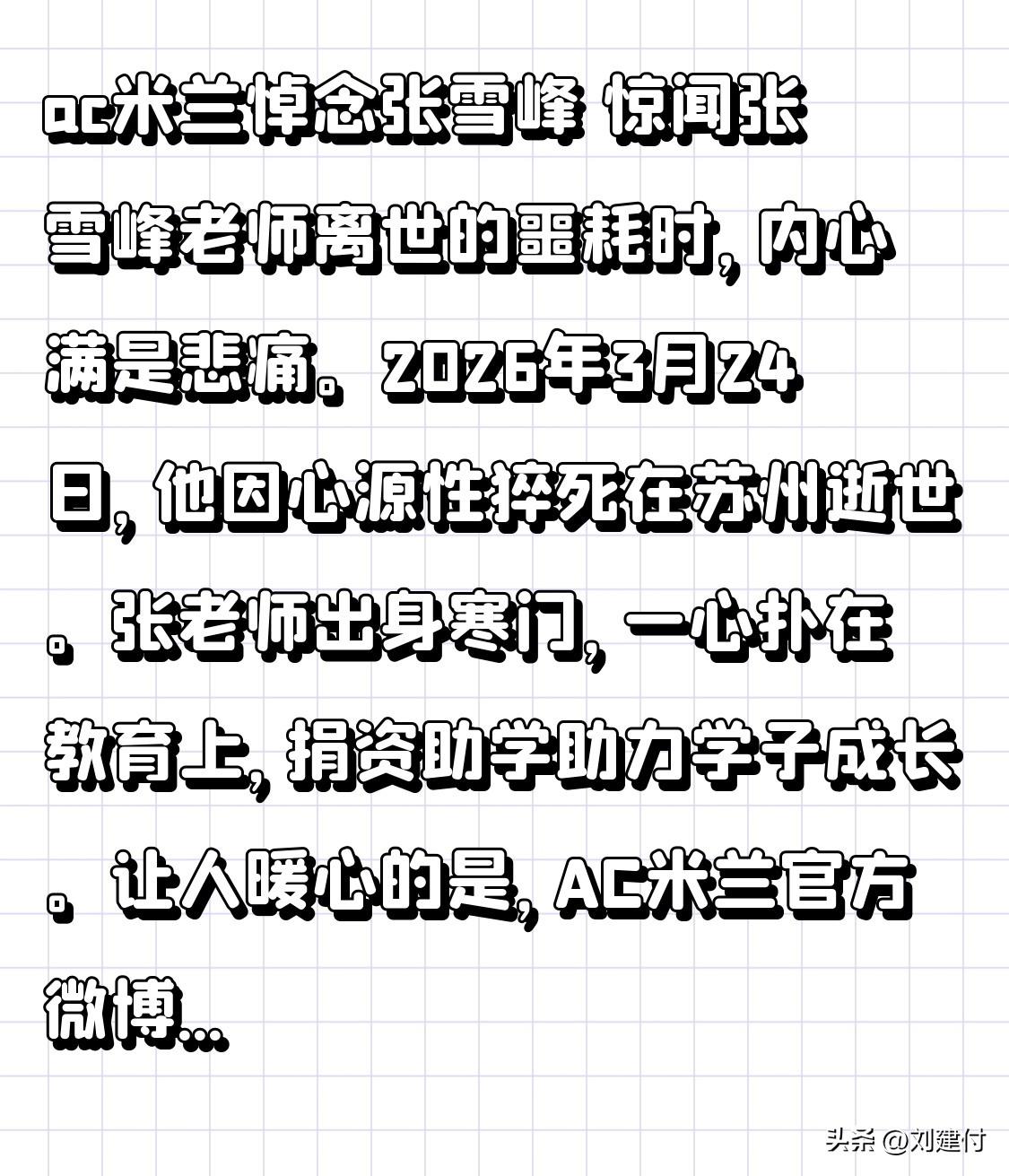 ac米兰悼念张雪峰 AC米兰悼念张雪峰 惊悉张雪峰老师离世,悲痛万分。2026年3月24日,他于苏州因心源性猝死辞世。张老师出身寒门,一心投身教育,捐资助学,助力学子成长。 令人动容的是,AC米兰官方微博发文悼念。张老师是20多年的AC米兰球迷,这或许就是双向奔赴的情感。张老师以专业与热情为无数学生指引方向,他喜爱的俱乐部也在他离去时致以哀悼。 生命无常,愿张老师一路走好,也提醒大家关注自身健康。