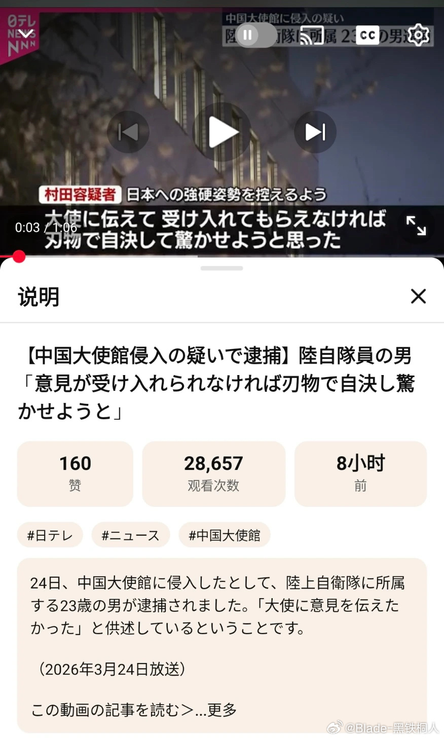 这事好离谱。朝日新闻已经确认闯入者是自卫队现役军人。大使馆属于领土现在日